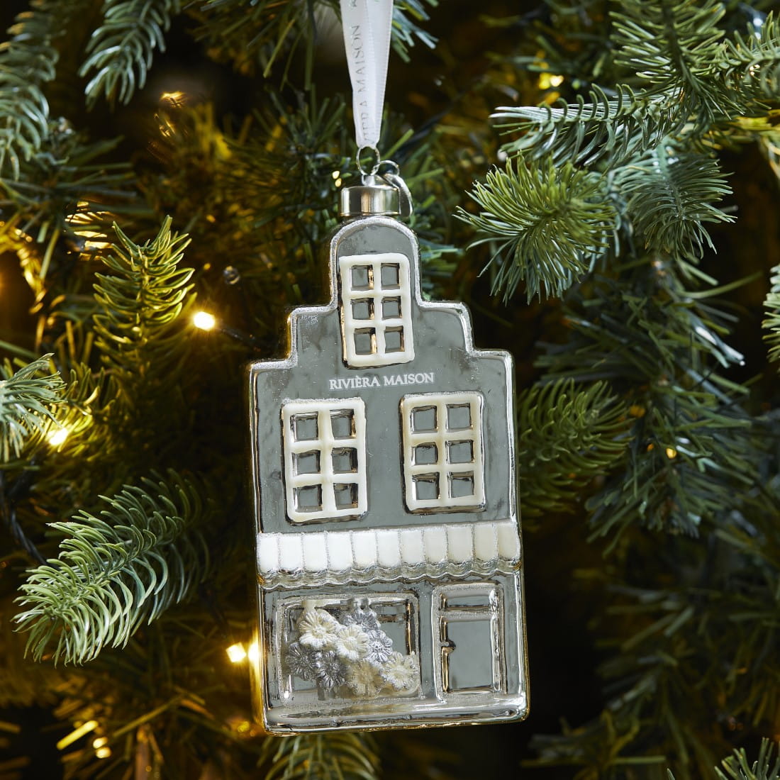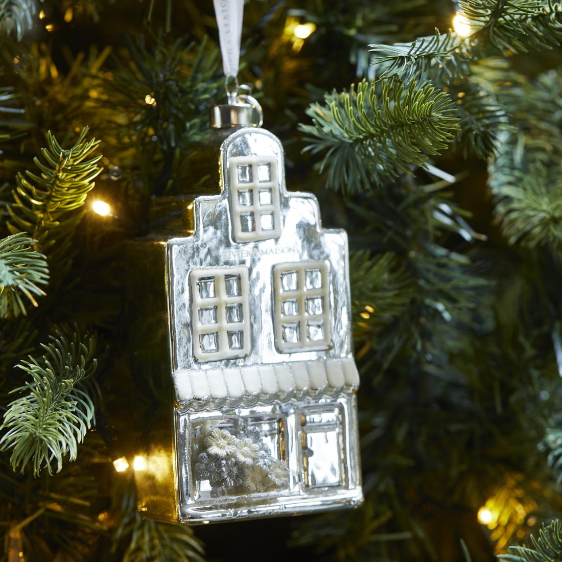 Ozdoba w kształcie domu nad kanałem jest naprawdę wyjątkowa, ze srebrnym wykończeniem, białymi akcentami i błyszczącym brokatem.
