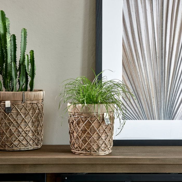 Ręcznie pleciony RR Diamond Weave Planter S to najmniejsza z dwóch identycznych donic rattanowych w naszej kolekcji.