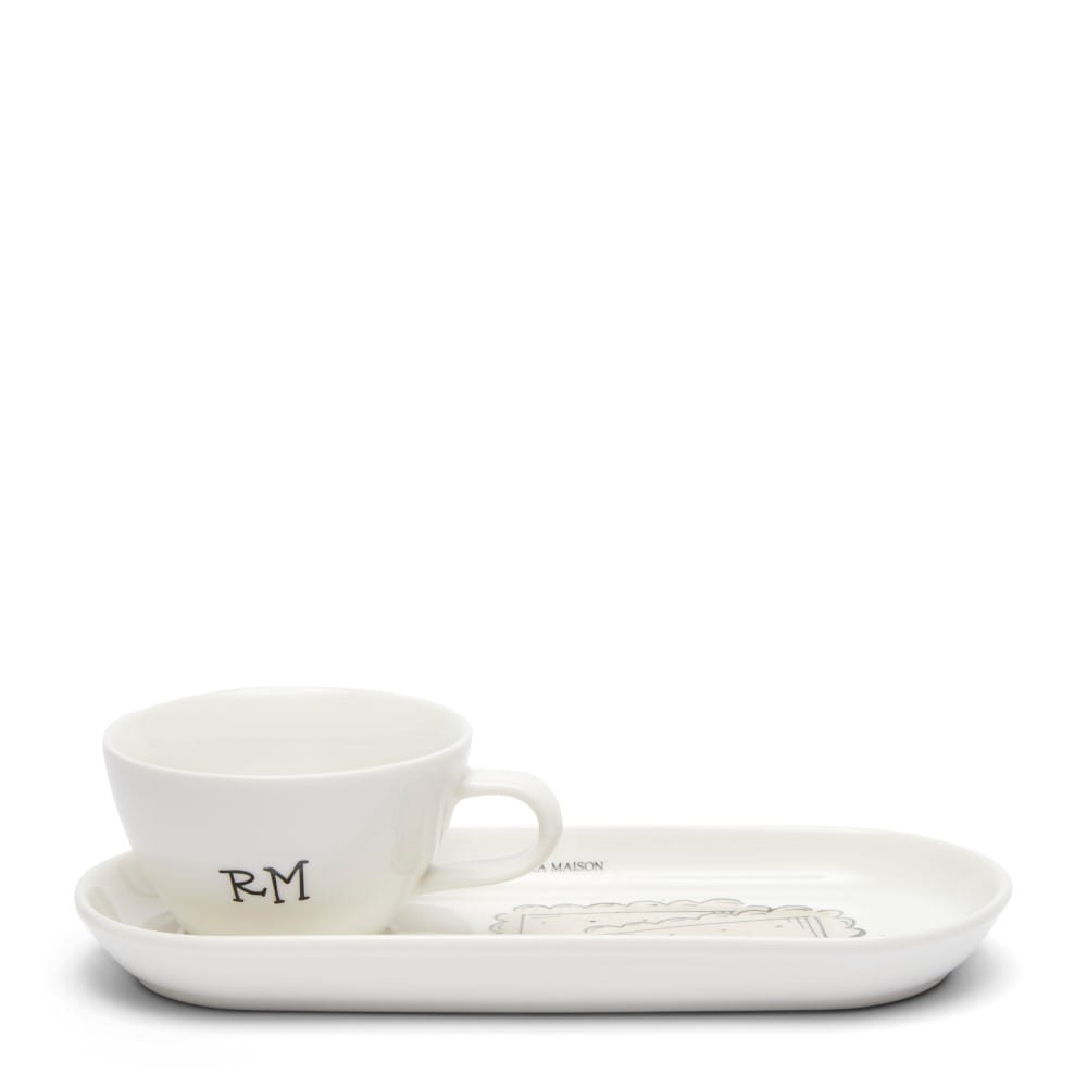 Na kubku jest napisane ozdobnym pismem „RM”.