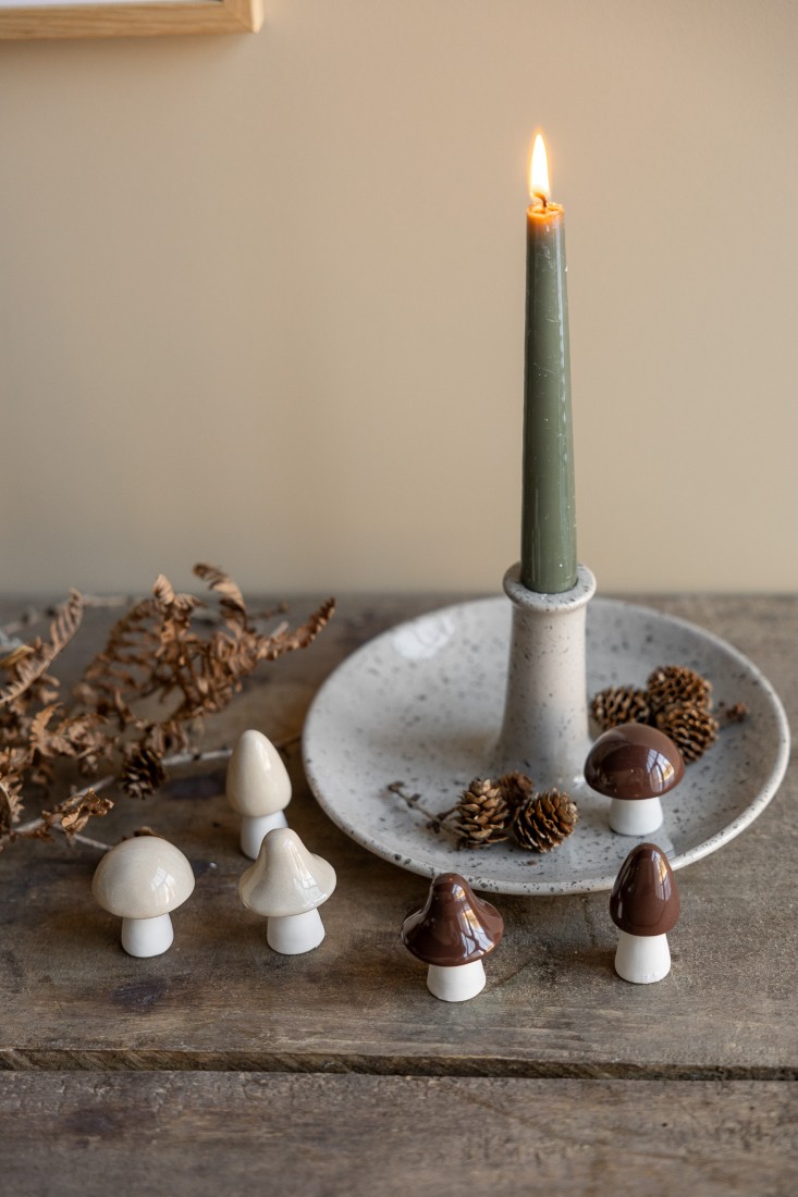 Każdy grzybek wykonany jest ręcznie, dzięki czemu wyróżnia się unikalnym charakterem – drobne nierówności czy punkciki w ceramice podkreślają jego naturalny urok. Świetnie prezentuje się solo, ale również w zestawie z innymi rozmiarami, tworząc efektowną kompozycję inspirowaną naturą.