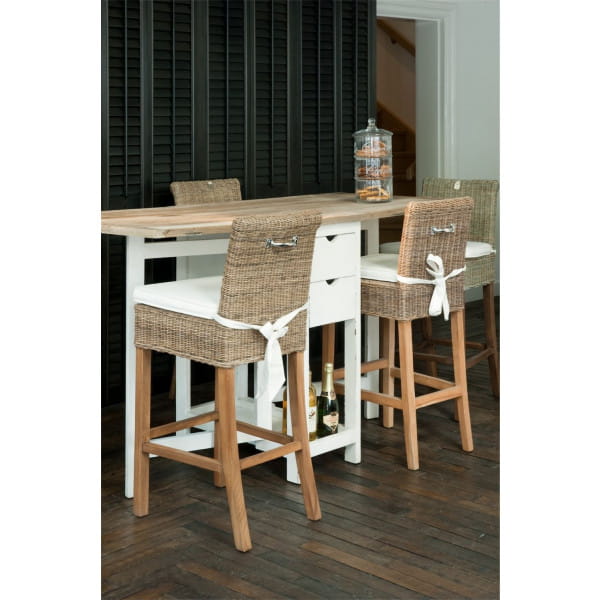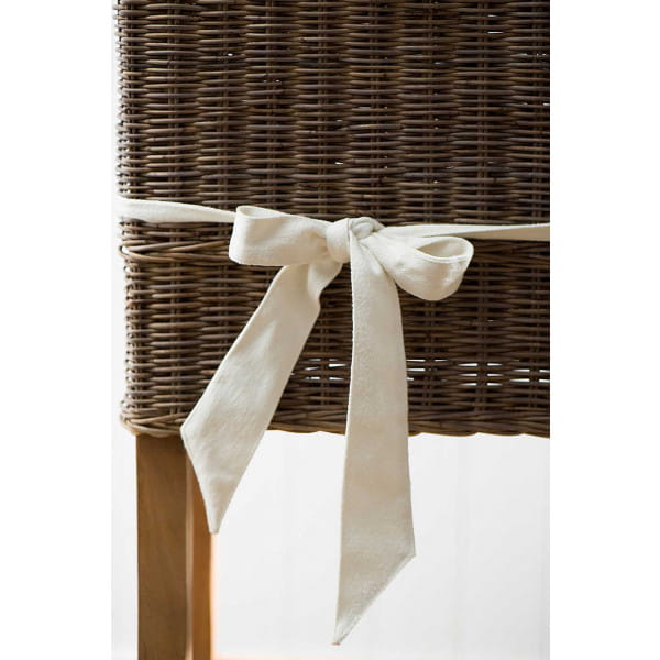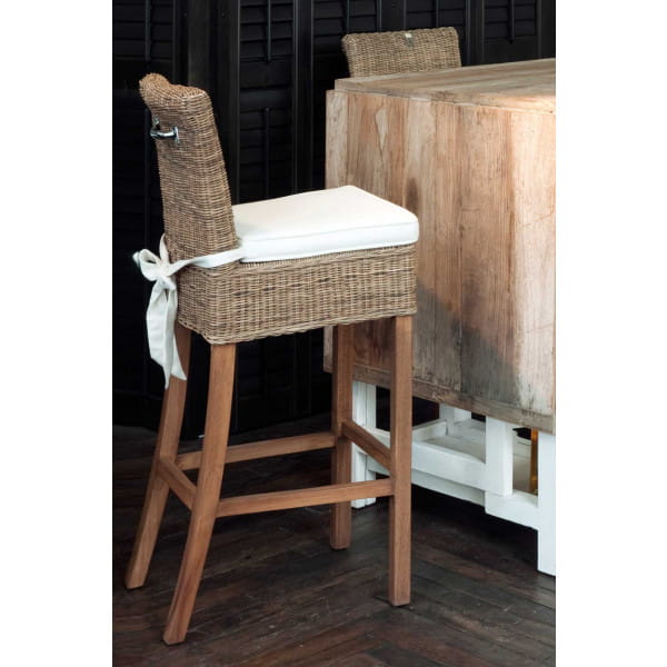 Mebel wytwarzany jest w stu procentach ręcznie, jego oparcie i siedzisko zdobi wytrzymały ratan, natomiast wysokie, masywne nóżki wykonane zostały z solidnego drewna o wybarwieniu mahoniowym. Miękkie, bawełniane siedzisko w białym kolorze zagwarantuje Ci komfort podczas spożywania posiłków w rodzinnym gronie czy spotkaniach przy kawie z przyjaciółmi. Ten estetyczny akcent pełni również funkcję dekoracyjną, nadając krzesłu elegancji.