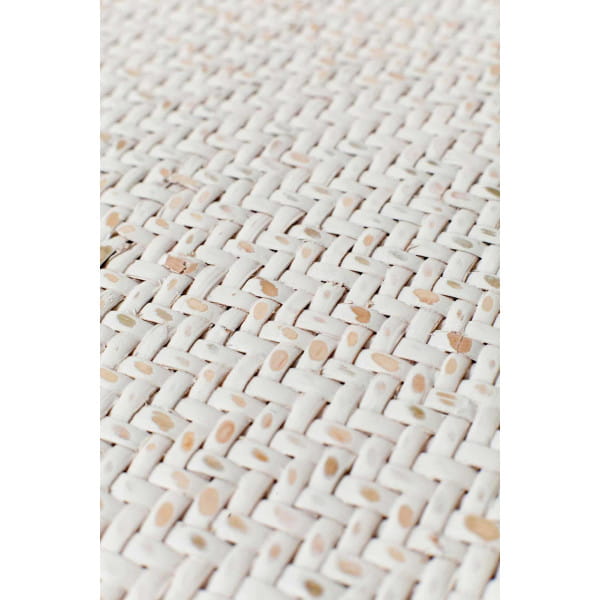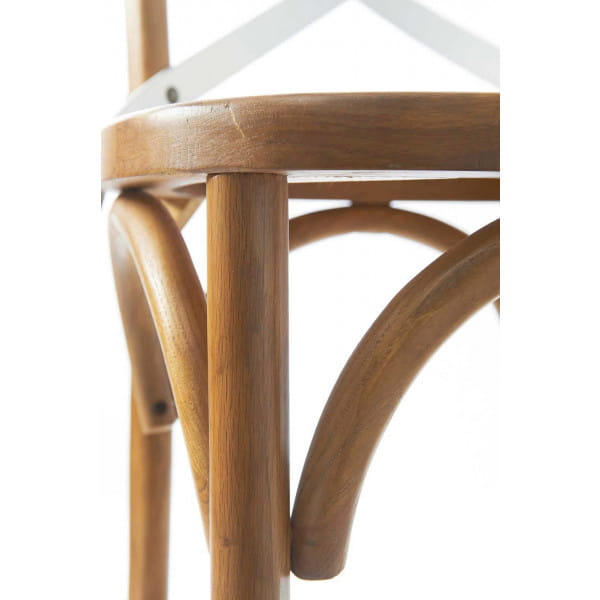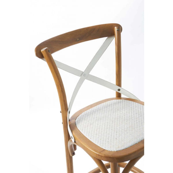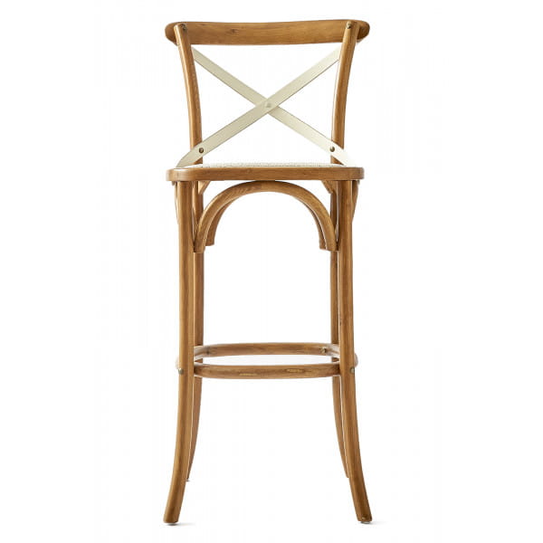 Dębowy stołek barowy ze skrzyżowanym oparciem i plecionym siedziskiem.