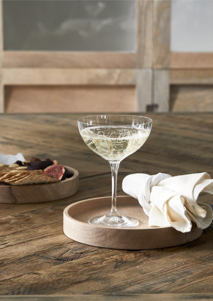 Kieliszek do szampana Salute wykonany ze szkła w Czeskiej fabryce posiada wypiaskowany napis po włosku Salute oraz Riviera Maison.