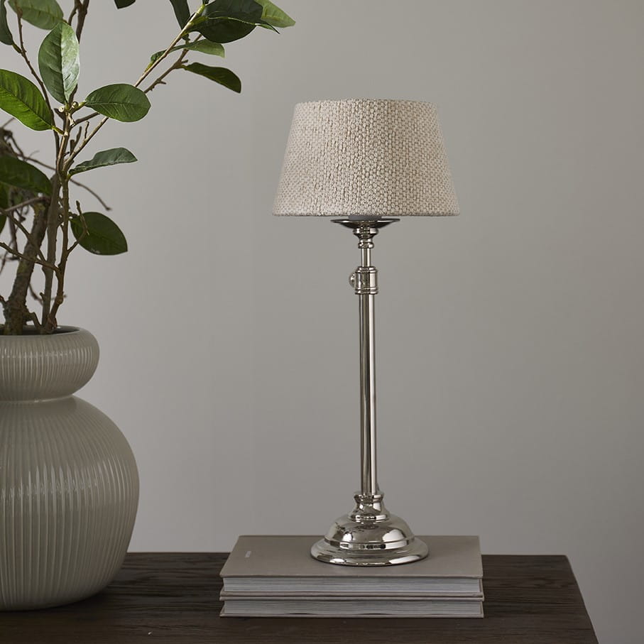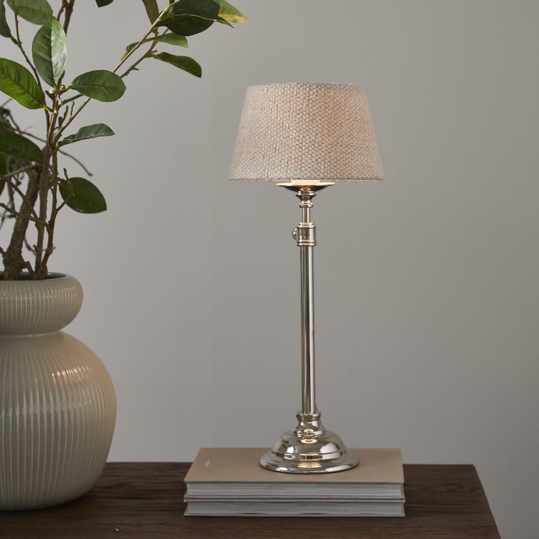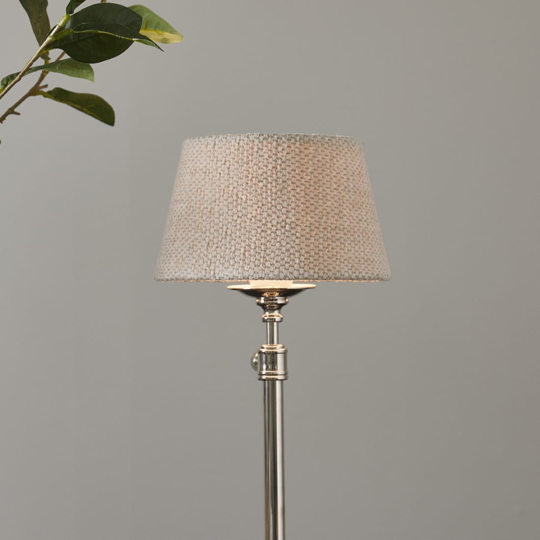 Ten abażur w delikatnym beżowym kolorze jest wykonany z tkaniny, co nadaje mu elegancki i wyrafinowany wygląd.