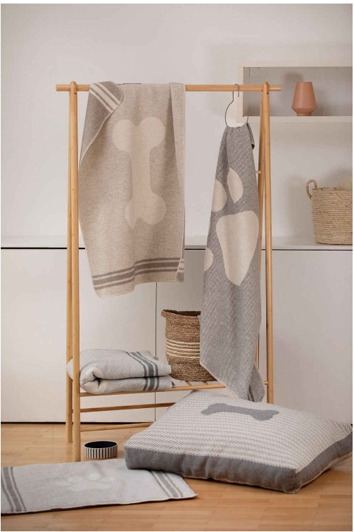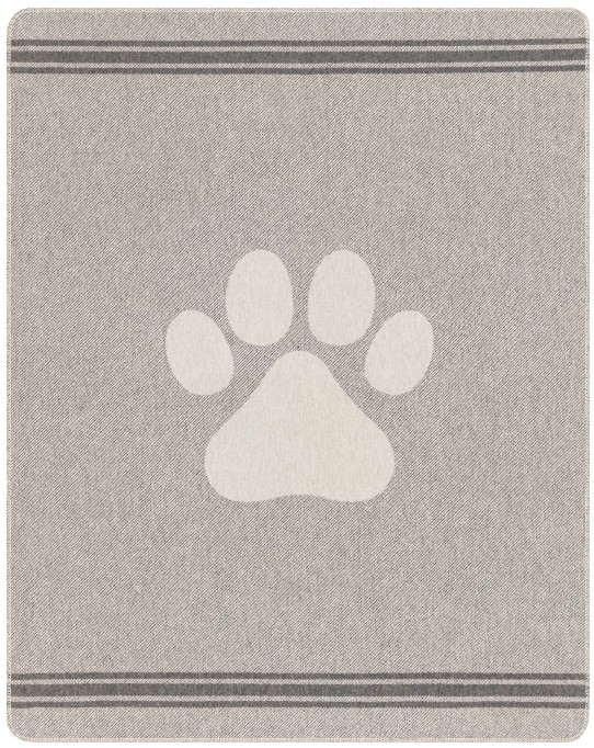 Miękki kocyk z dekoracyjnym motywem łapki to przytulny dodatek do domu każdego miłośnika zwierząt. Stonowana kolorystyka oraz subtelne pasy przy