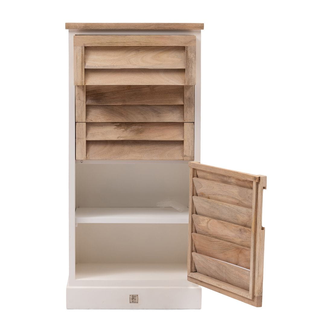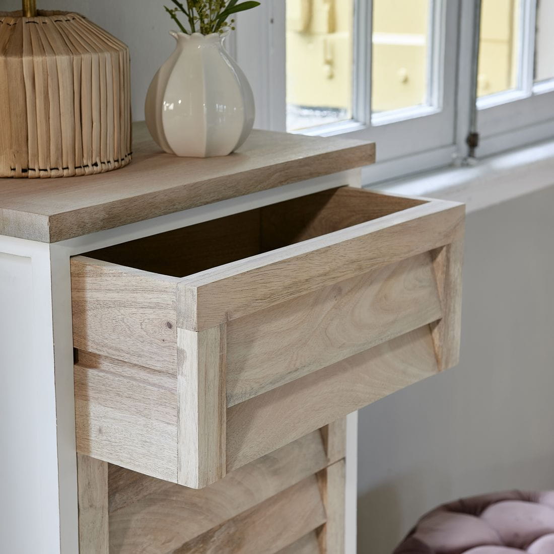 To szafka z trzema szufladami i drzwiczkami, co czyni ją przydatnym meblem do sypialni np. Na ubrania. Jest częścią kolekcji Pacifica. Uderzająca linia z meblami o „wyglądzie migawki” z naturalnego i białego drewna mango z ukrytym uchwytem i mechanizmem cichego domykania. Ta seria oferuje różne rodzaje mebli. Naturalne drewno mango z którego są wykonane meble może odbiegać kolorystycznie od widocznych na zdjęciu !