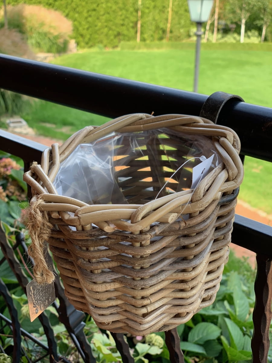 Kosz balkonowy wypleciony z naturalnego rattanu pochodzącego z Indonezji, wyłożony wytrzymałą folią.