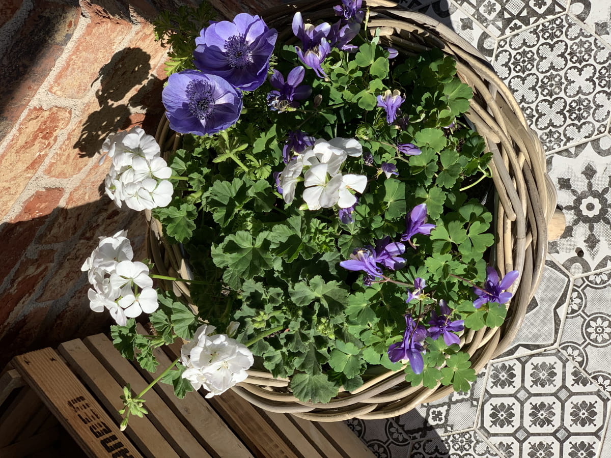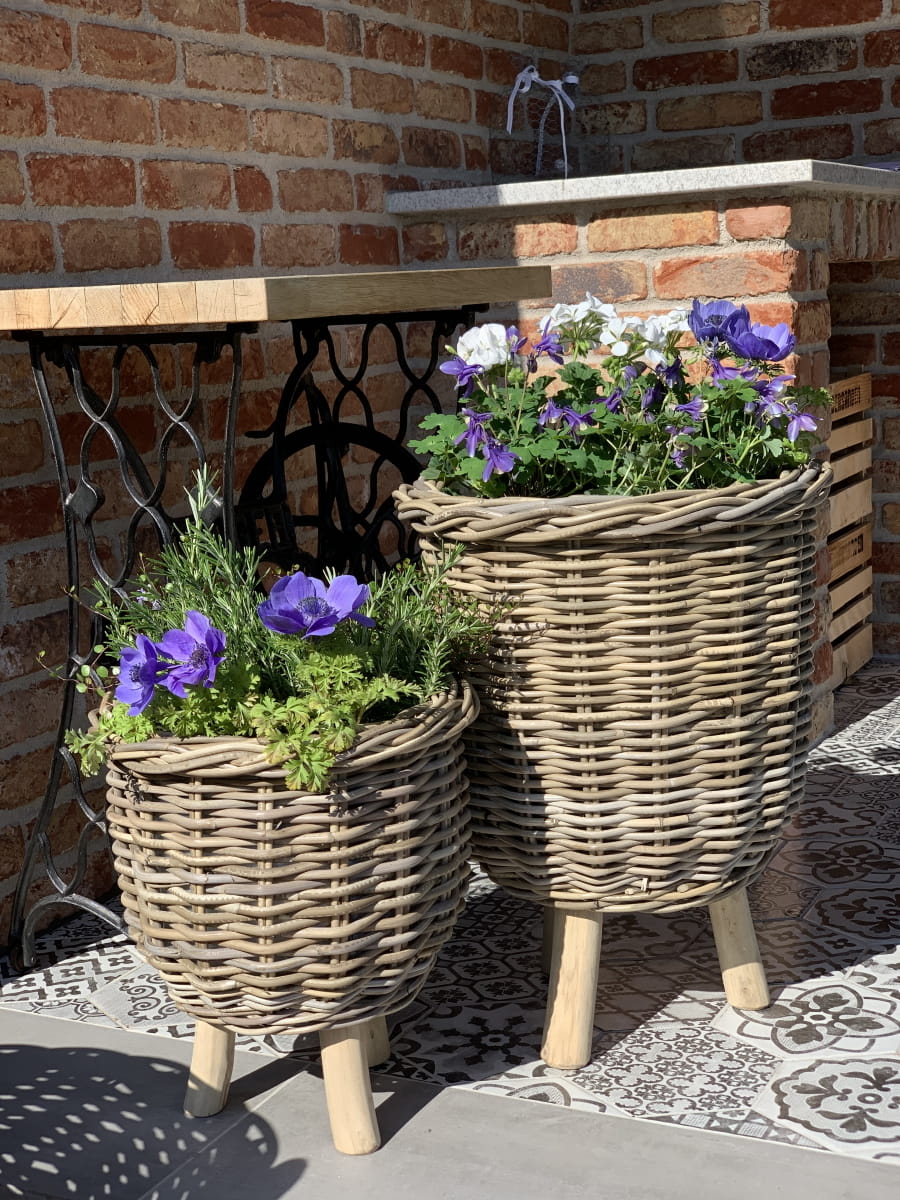 Kosz ratanowy, który spełnia formę doniczki, dzięki któremu stworzysz piękną kompozycję sezonową na taras lub balkon.