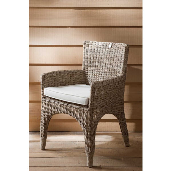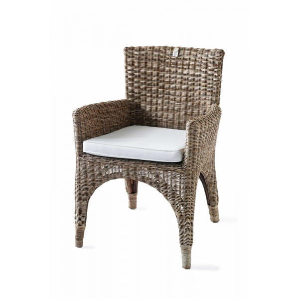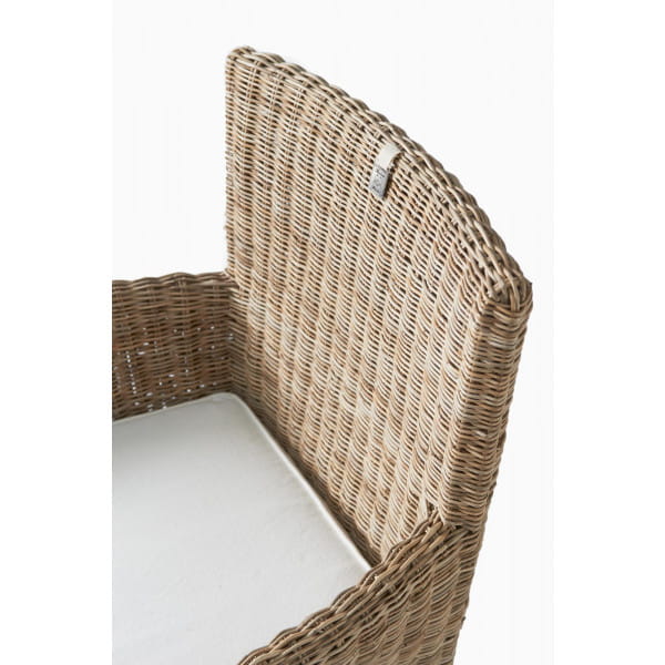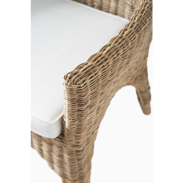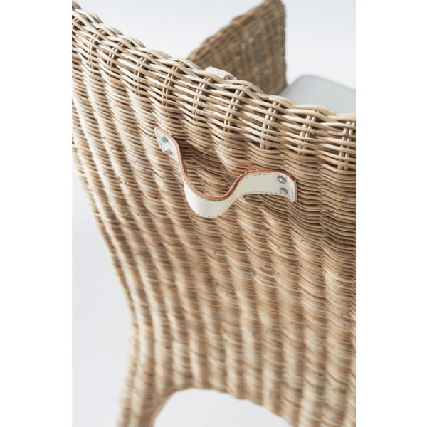 Krzesło do jadalni wykonane z rustykalnego rattanu. Brązowy skórzany uchwyt jest przymocowany do tylnej strony oparcia krzesła. Rustic Rattan to naturalny produkt, który uzyskuje kolor z naturalnego procesu, dlatego każdy produkt jest wyjątkowy.