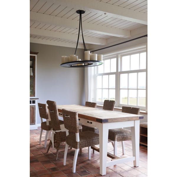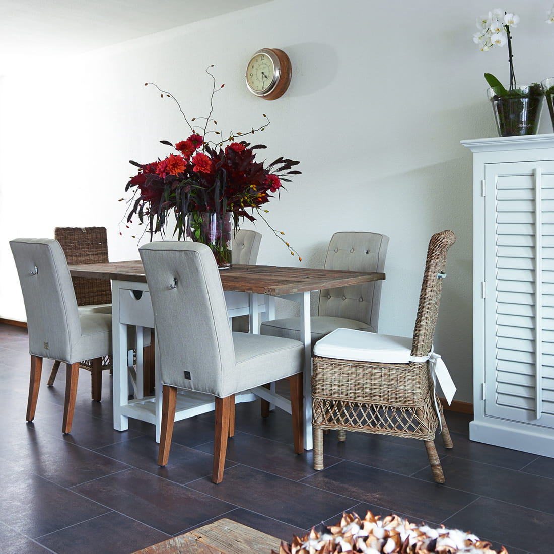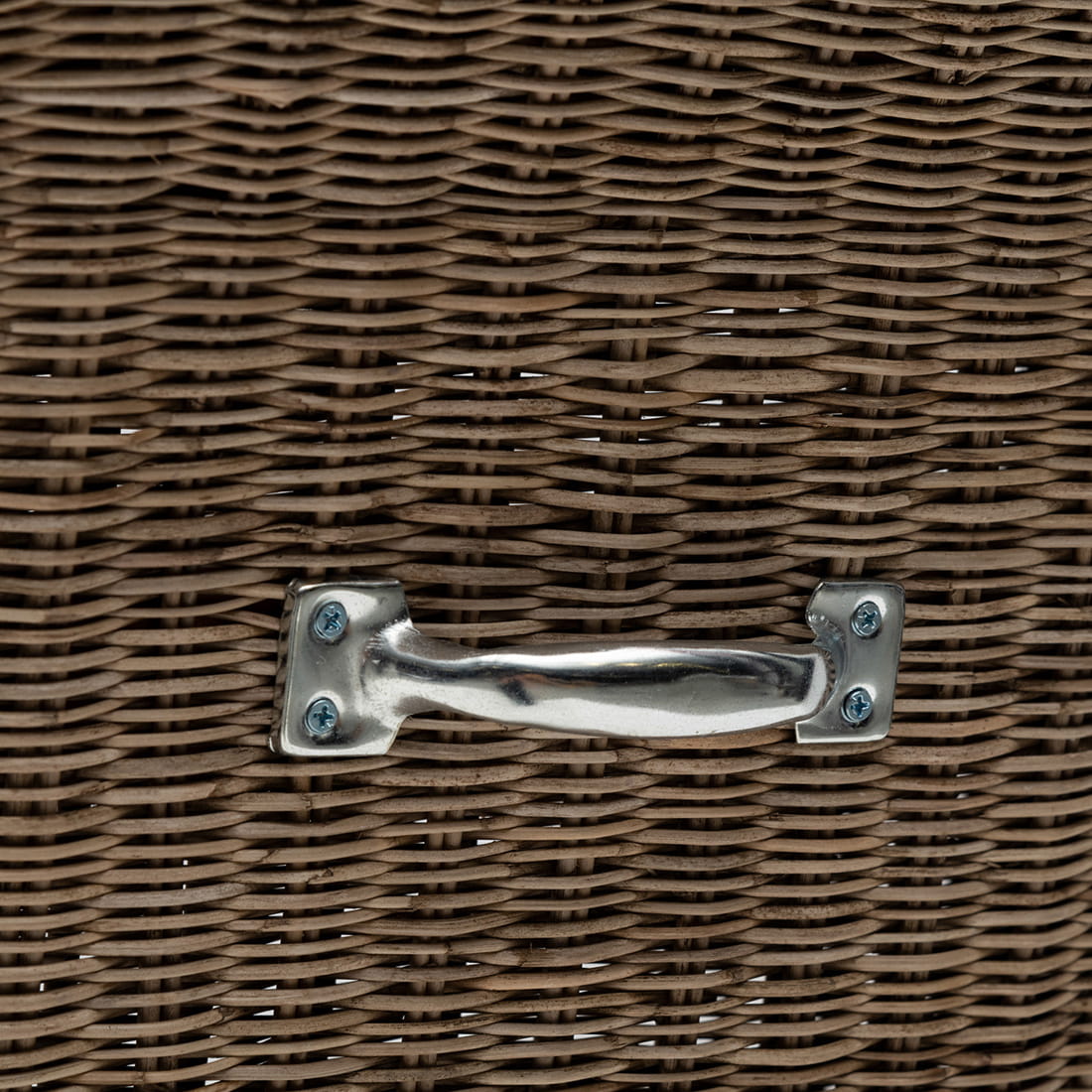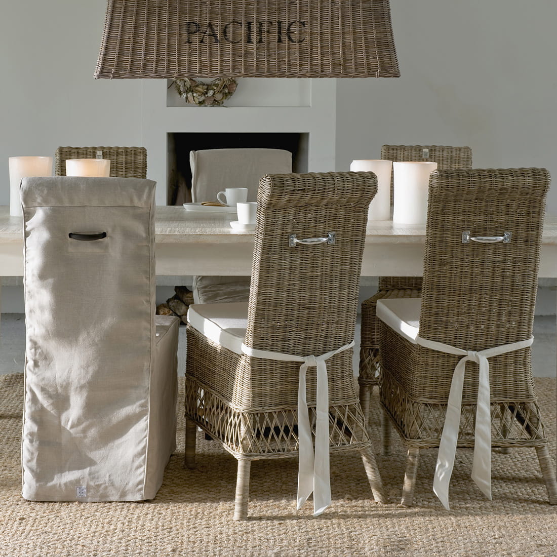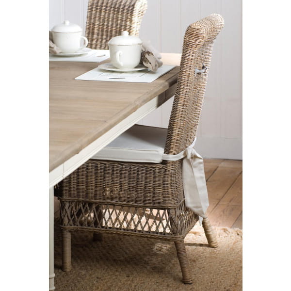 Krzesło do jadalni wykonane z rustykalnego oraz naturalnego ratanu, ręcznie wyplatane. Metalowy uchwyt jest przymocowany do tylnej strony oparcia krzesła. Szary kolor ratanu powstaje w wyniku naturalnego procesu: w rezultacie kolor może się nieznacznie różnić w zależności od przedmiotu, co oznacza, że każdy mebel jest wyjątkowy. Siedzisko wykonane jest w 100% z bawełny.