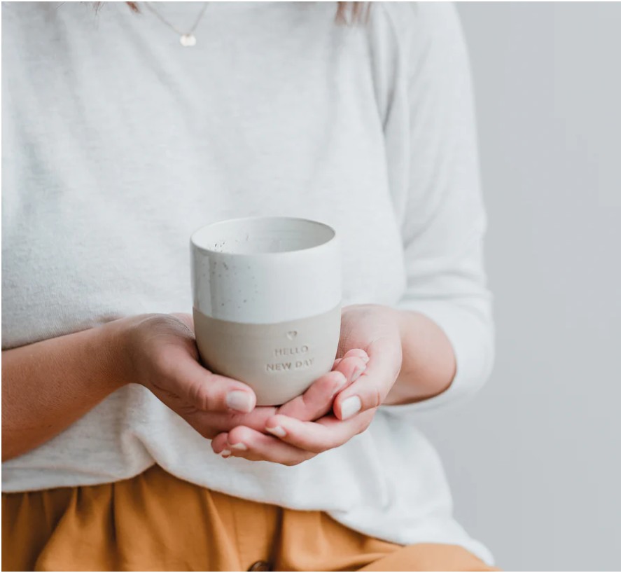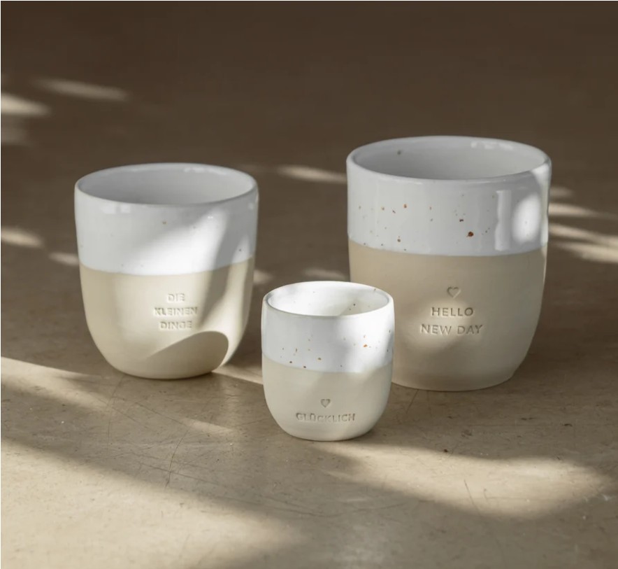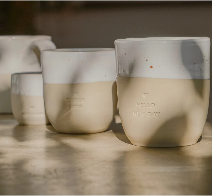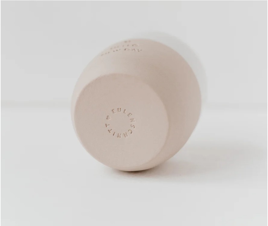 Ręcznie wykonany w portugalskiej manufakturze kubek z naturalnej kamionki, ozdobiony subtelnym tłoczeniem „Me Time”.