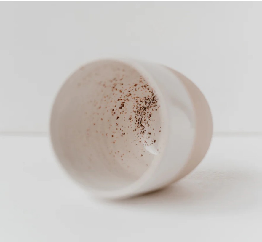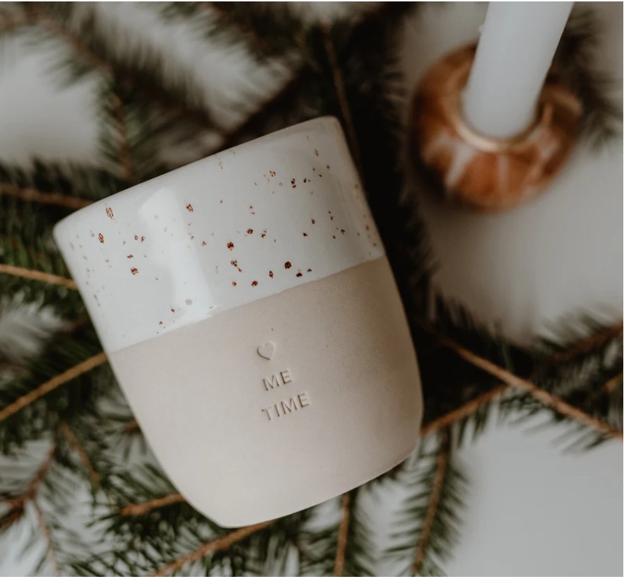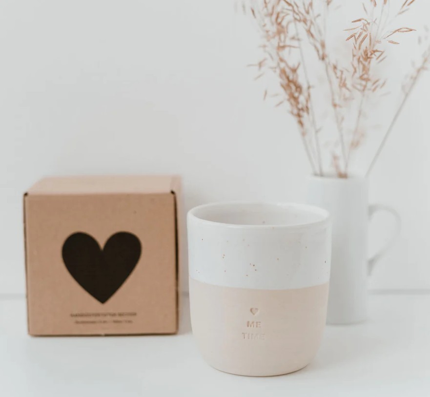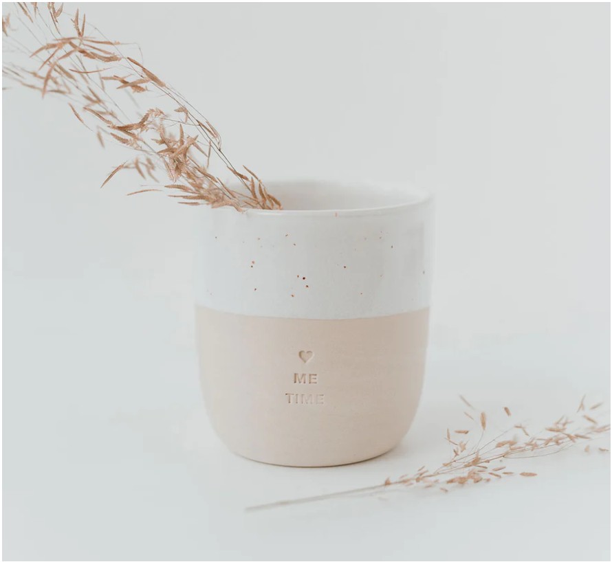Ręcznie wykonany w portugalskiej manufakturze kubek z naturalnej kamionki, ozdobiony subtelnym tłoczeniem „Me Time”.