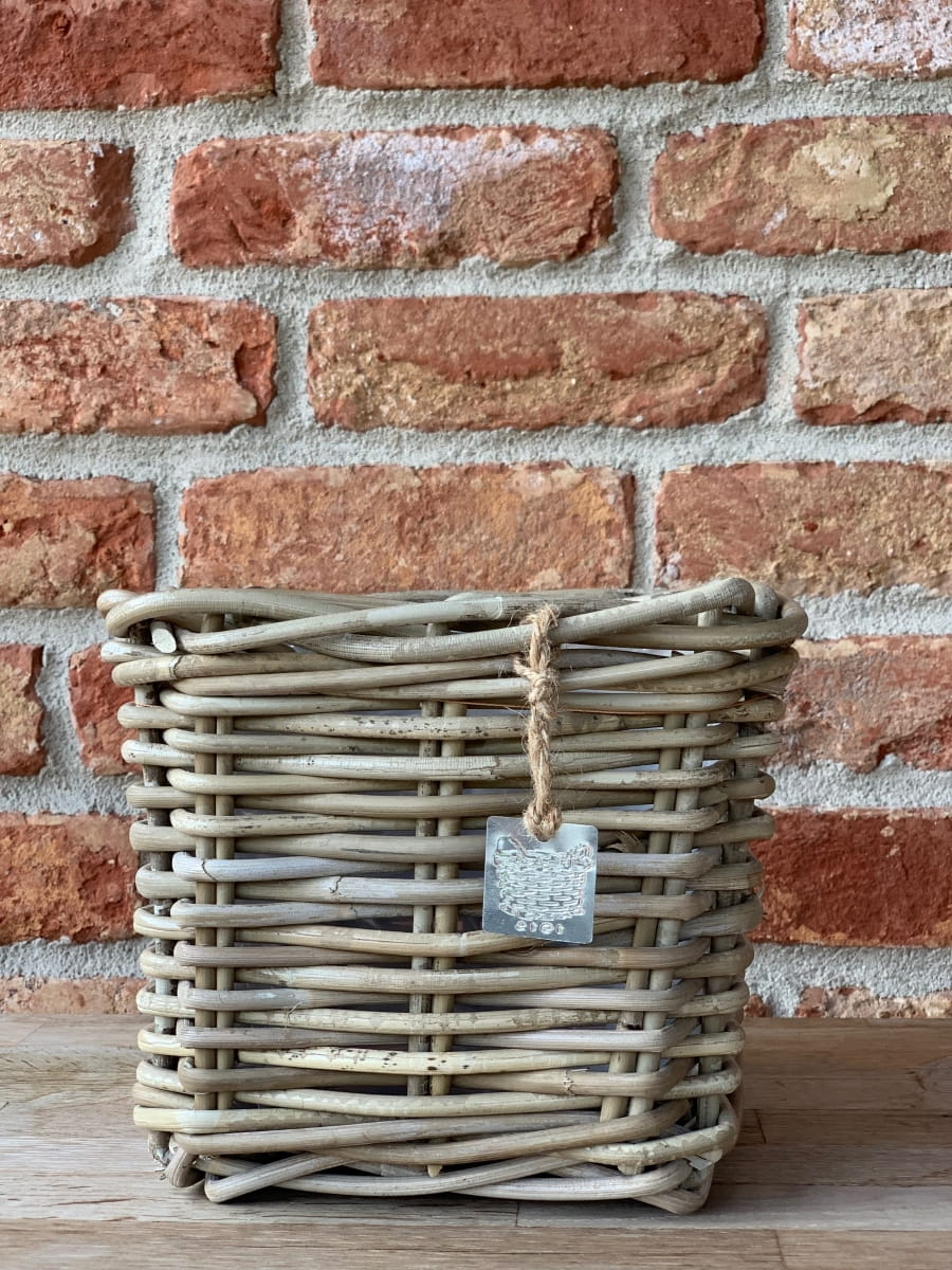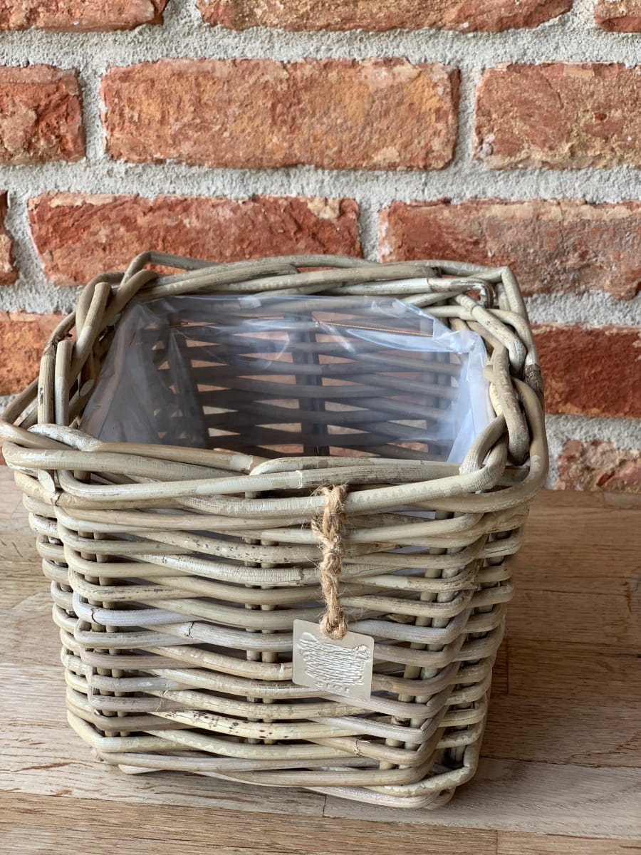Kwadratowa donica z naturalnego ratanu w kolorze szarym, wyściełana folią.