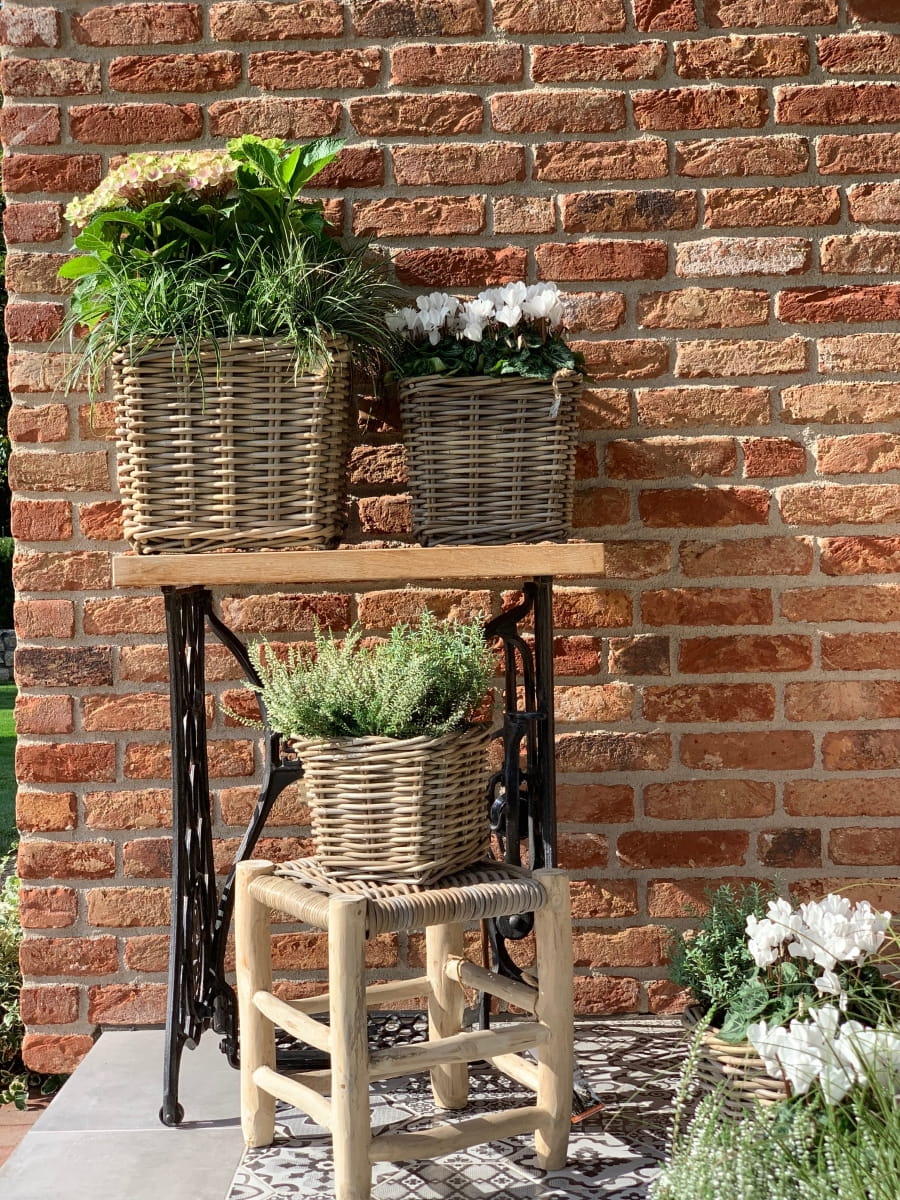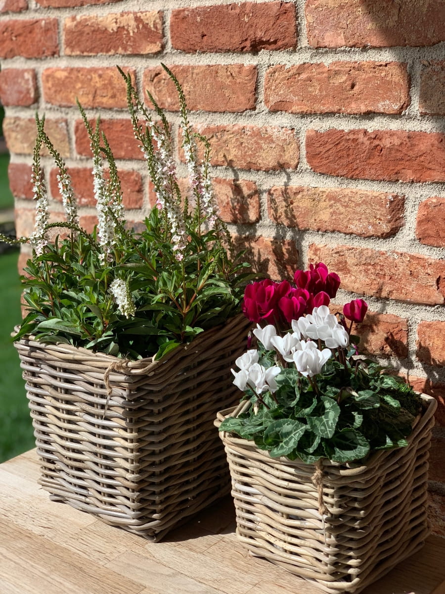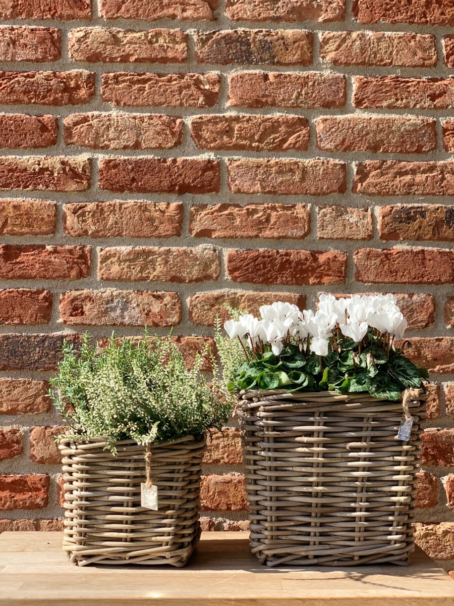 Kosz ratanowy, który spełnia formę doniczki, dzięki któremu stworzysz piękną kompozycję sezonową na taras lub balkon.