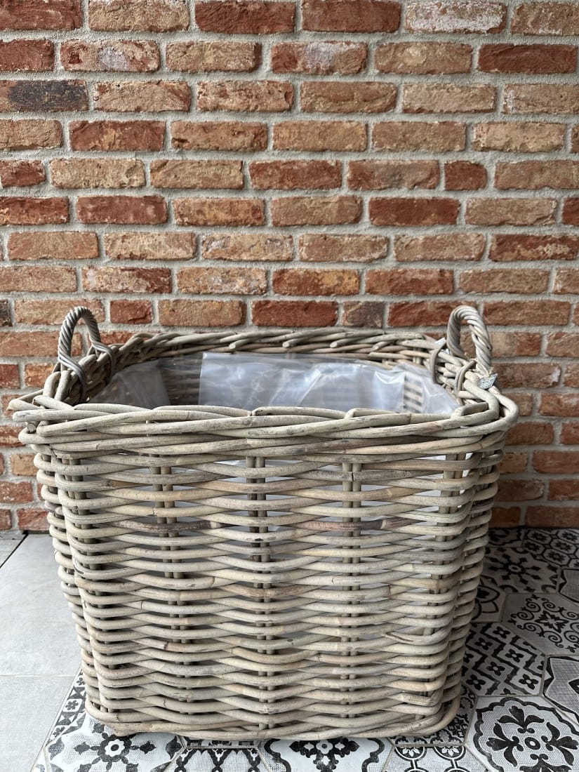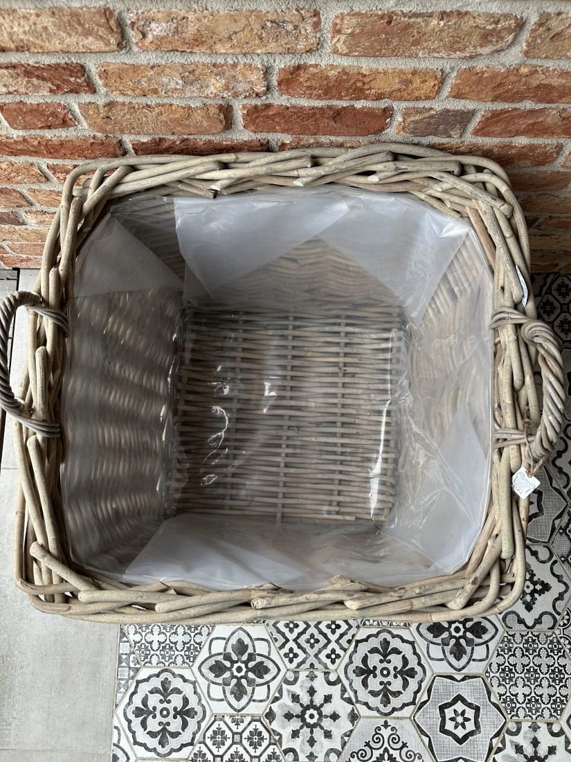 Kwadratowy kosz z grubego rattanu wyściełany folią z uchwytami po bokach.