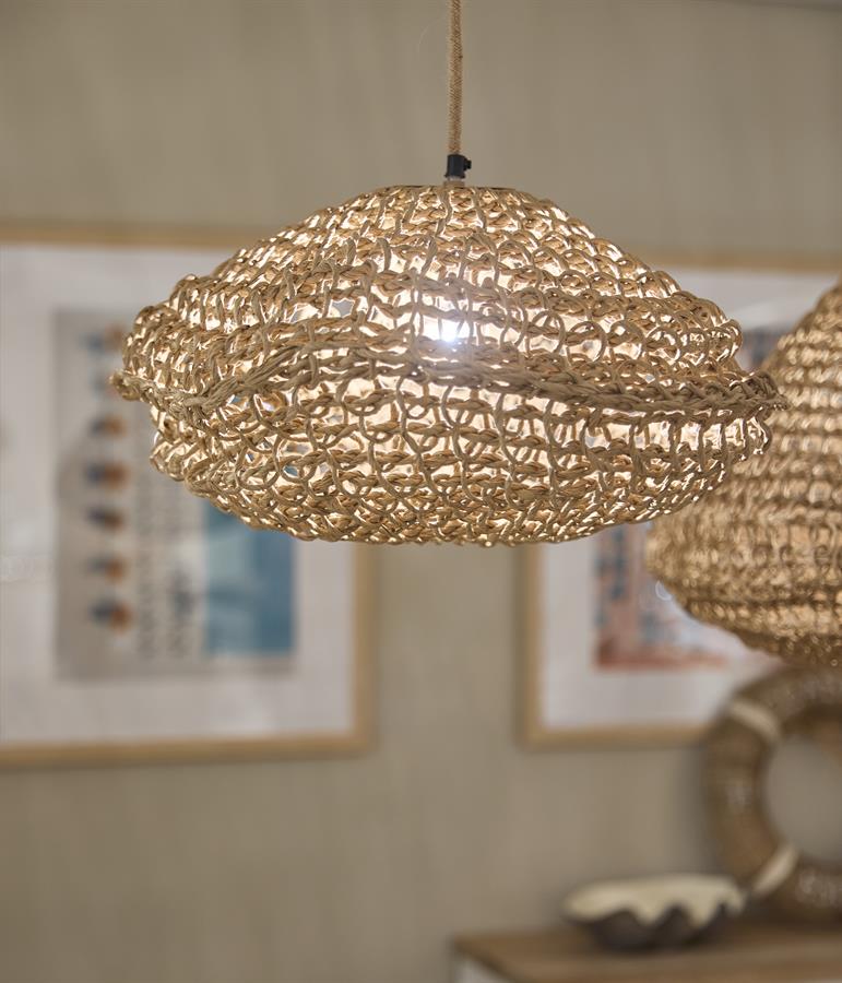 Naturalna lampa wisząca o lekkiej, ażurowej formie, wykonana z plecionego włókna roślinnego, wprowadza do wnętrza ciepło i swobodny, przytulny klimat.