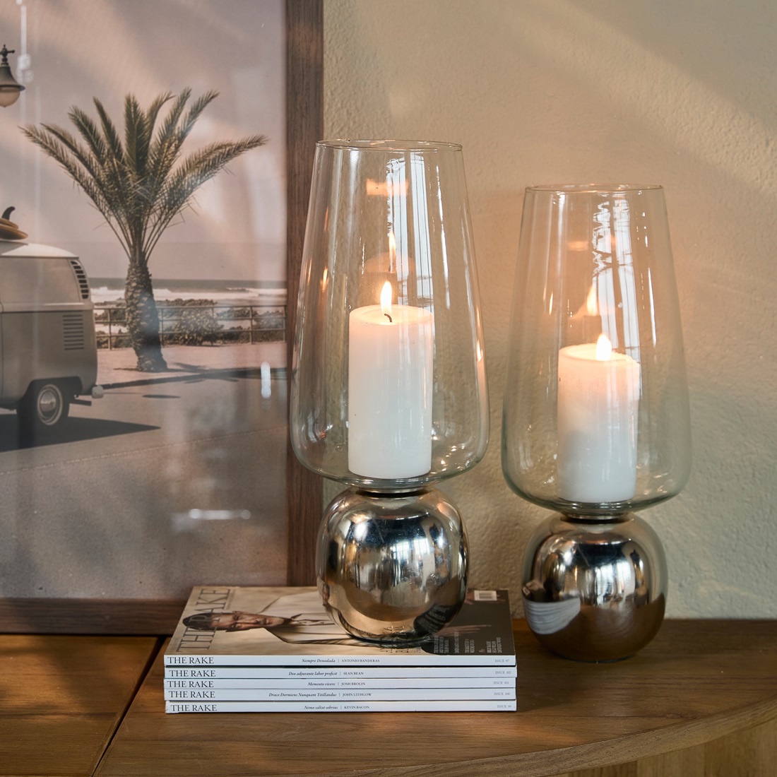 Elegancka latarenka Velique zachwyca harmonijnym połączeniem szkła i metalicznej podstawy o subtelnym połysku.