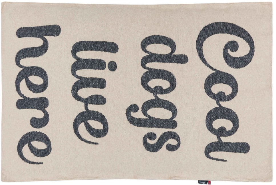 Wygodne legowisko dla psa z dekoracyjnym napisem „Cool Dogs Live Here”, które wprowadza do wnętrza lekki, przyjazny akcent i podkreśla obecność