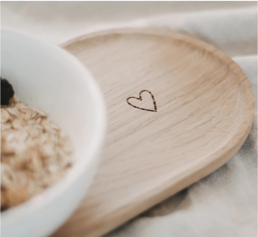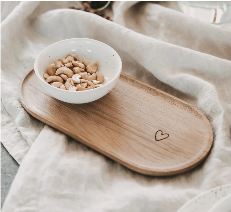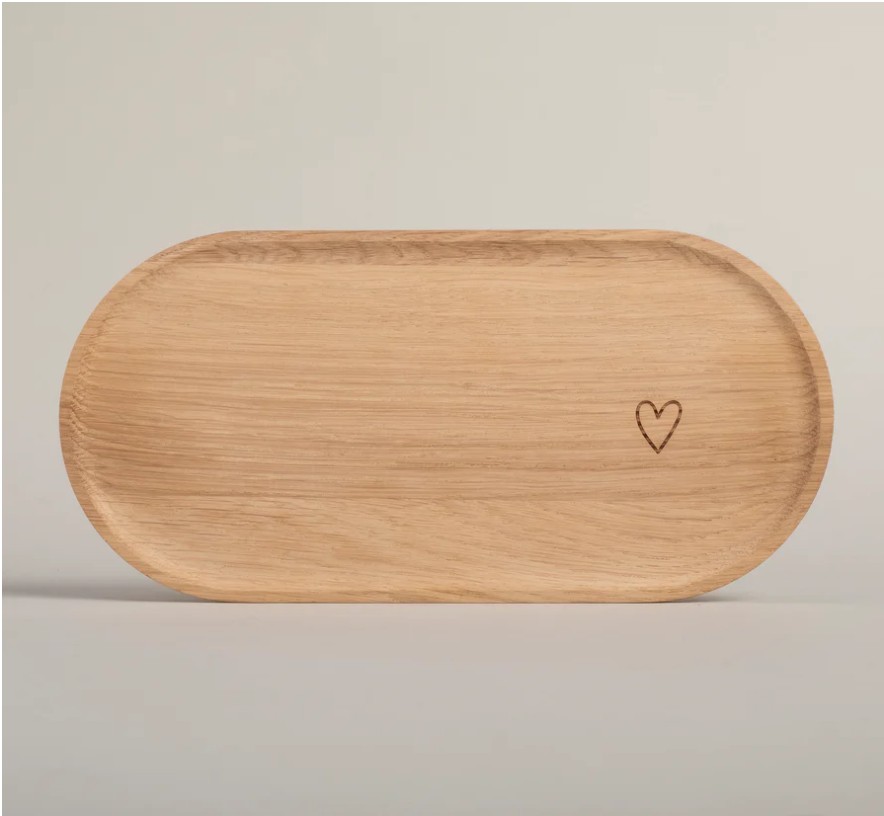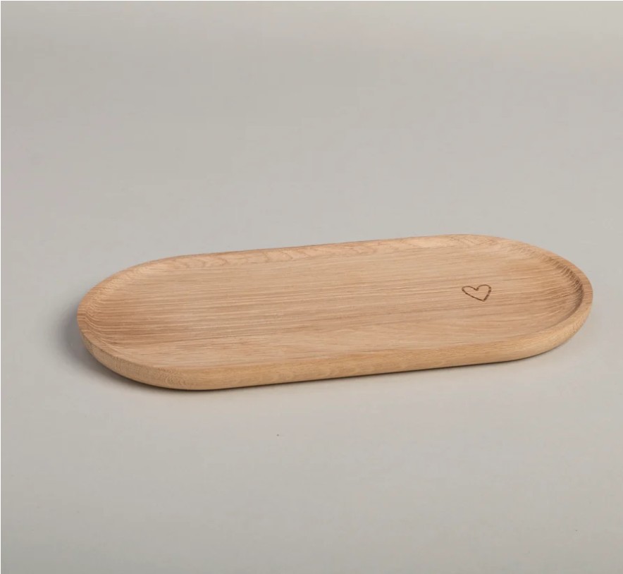Mała taca z naturalnego dębu, ozdobiona grawerem w kształcie serca.