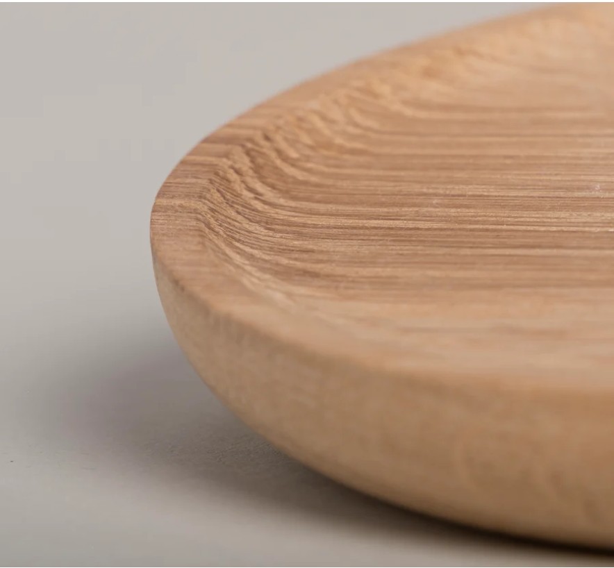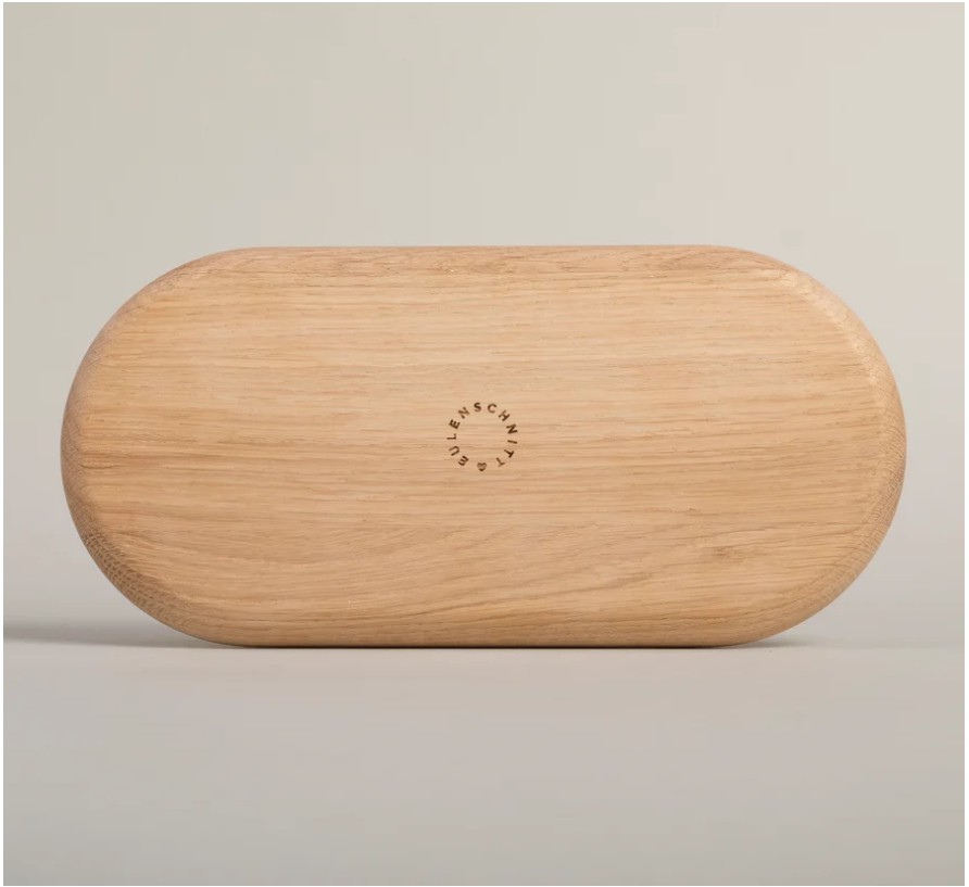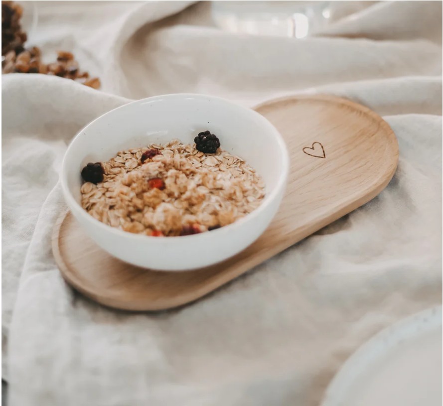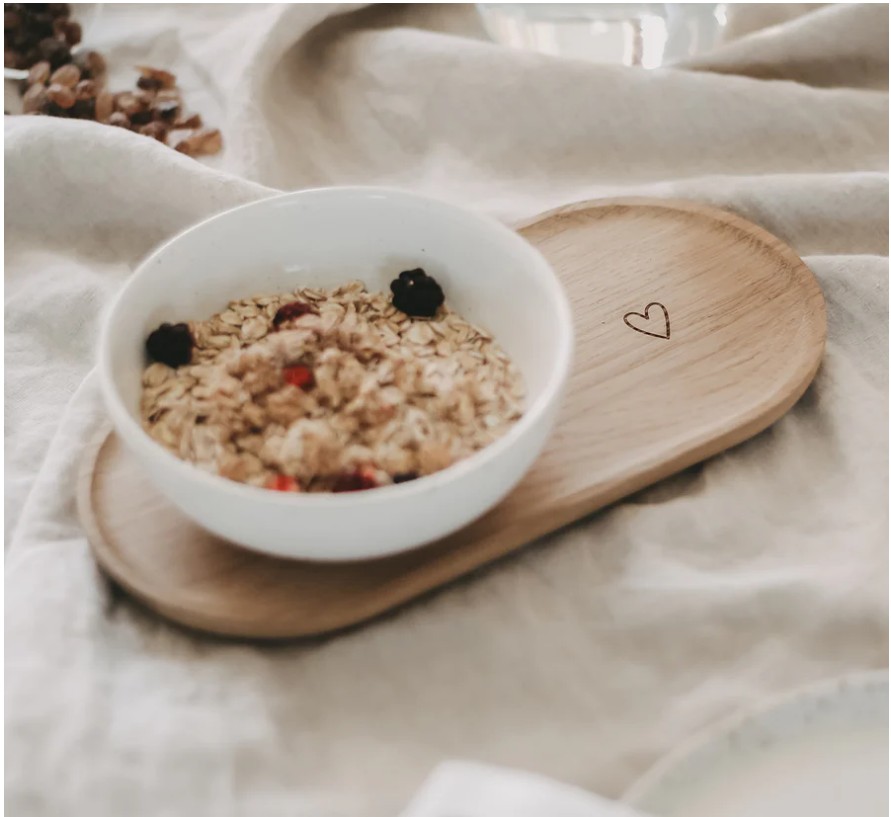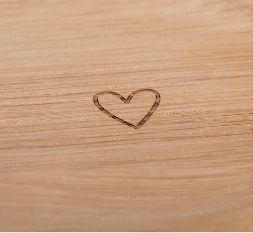 Mała taca z naturalnego dębu, ozdobiona grawerem w kształcie serca.