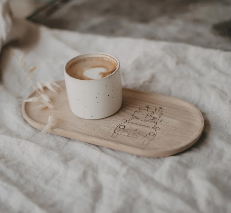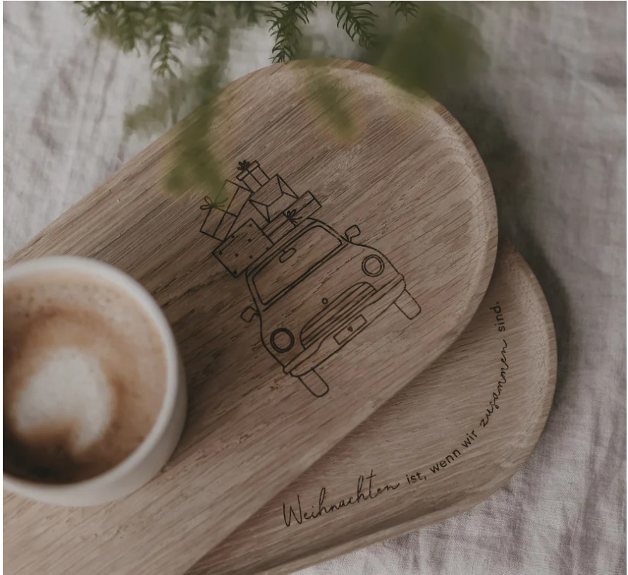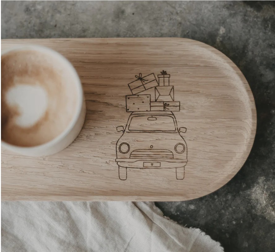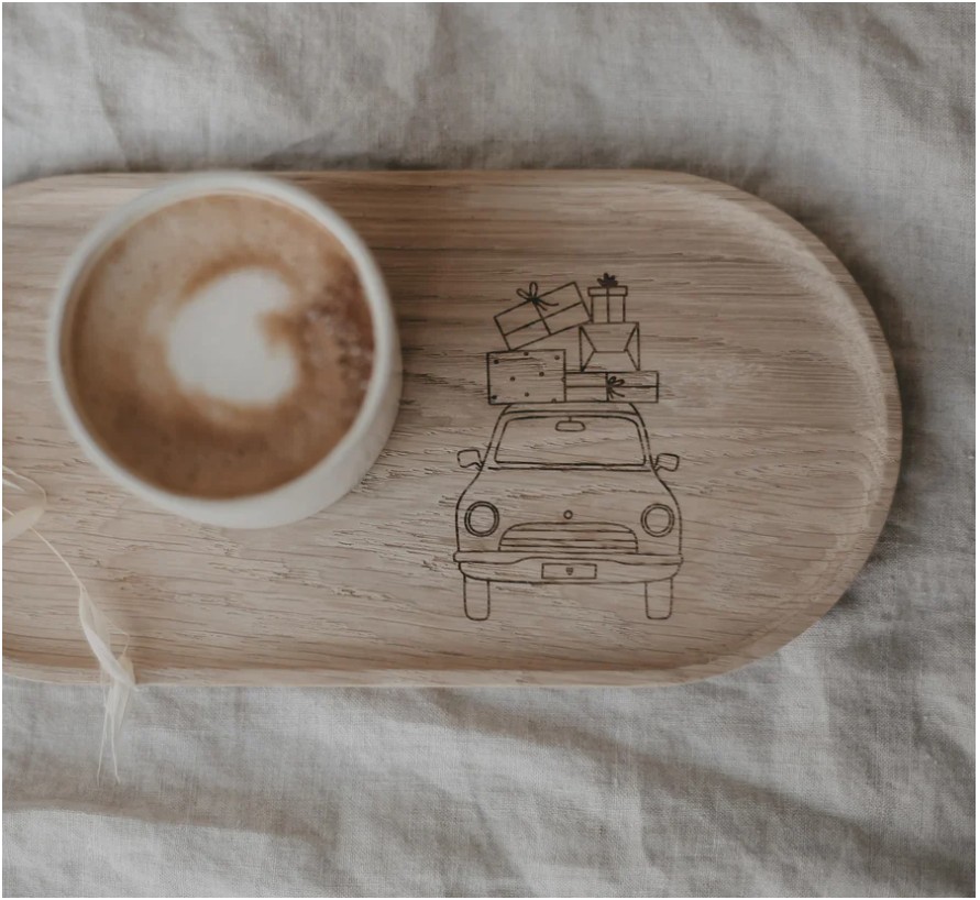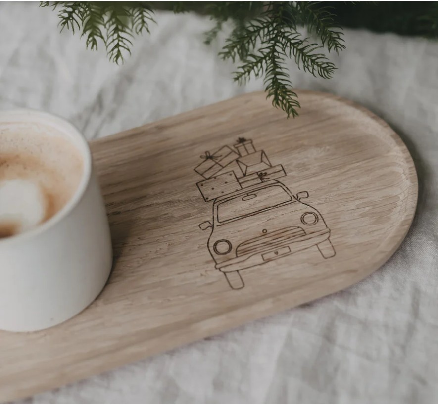 Niewielka taca z naturalnego dębu, ozdobiona laserowym grawerem z motywem świątecznego auta.