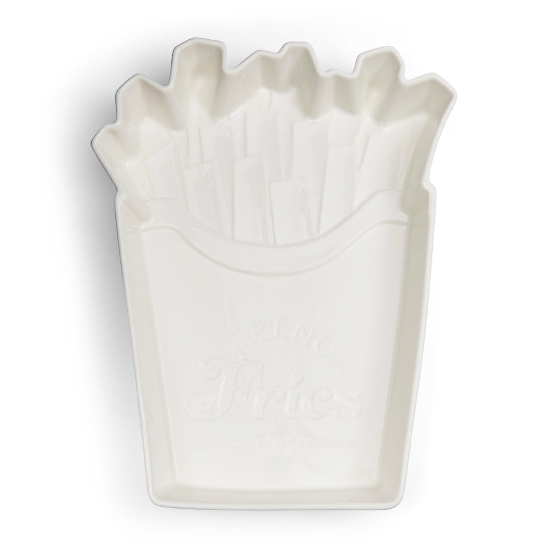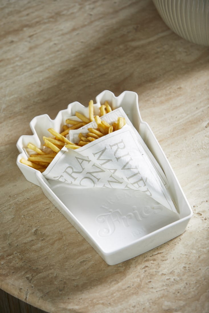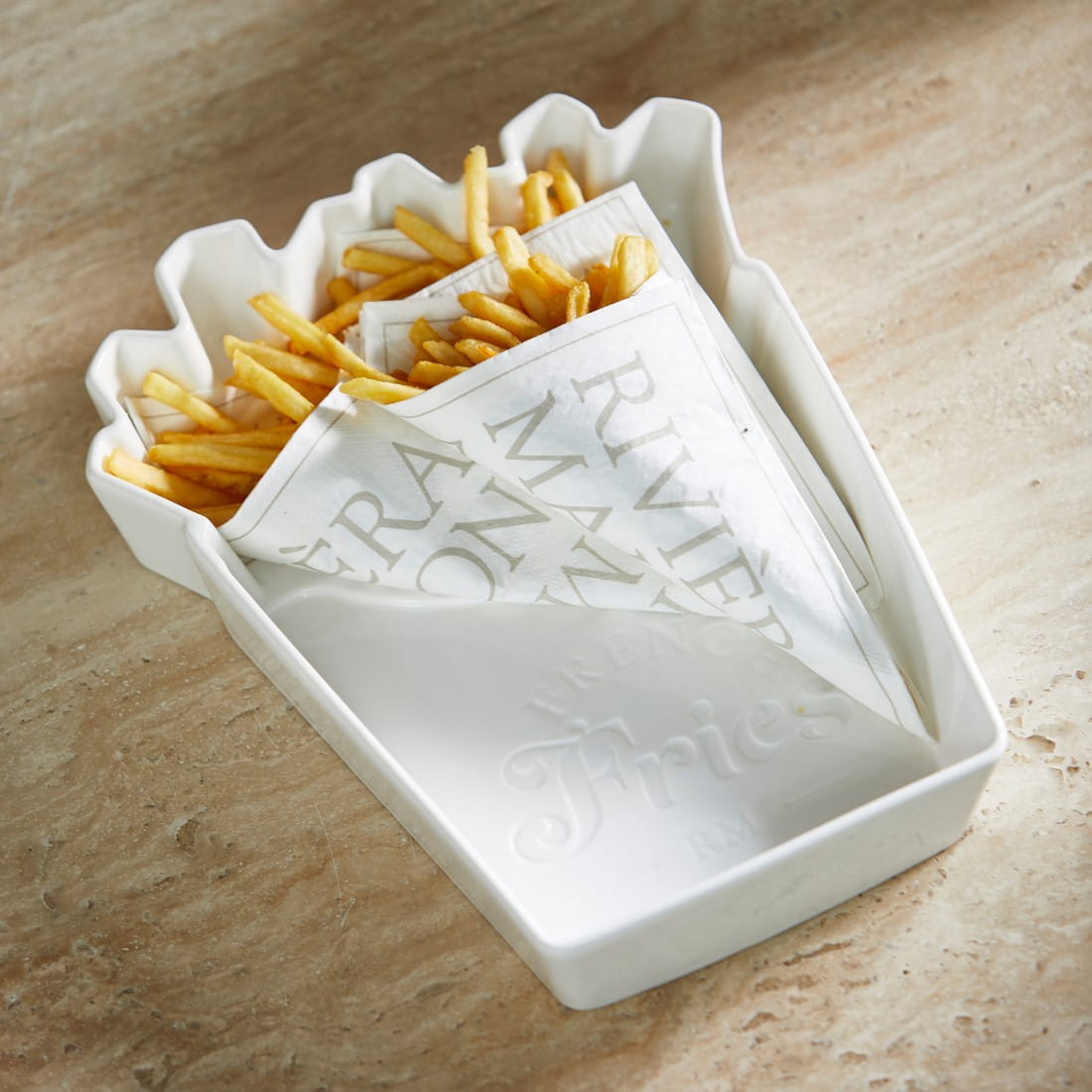 Biała miska ma kształt tacy na frytki, z napisem „French Fries” i logo RM subtelnie nadrukowanym pośrodku.