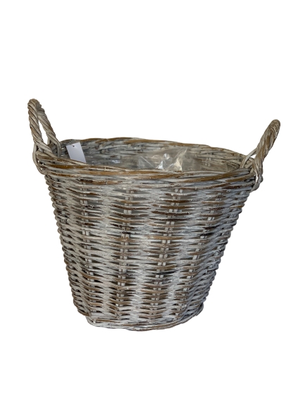 Okrągła donica z naturalnego ratanu w kolorze białym, wyściełana folią.