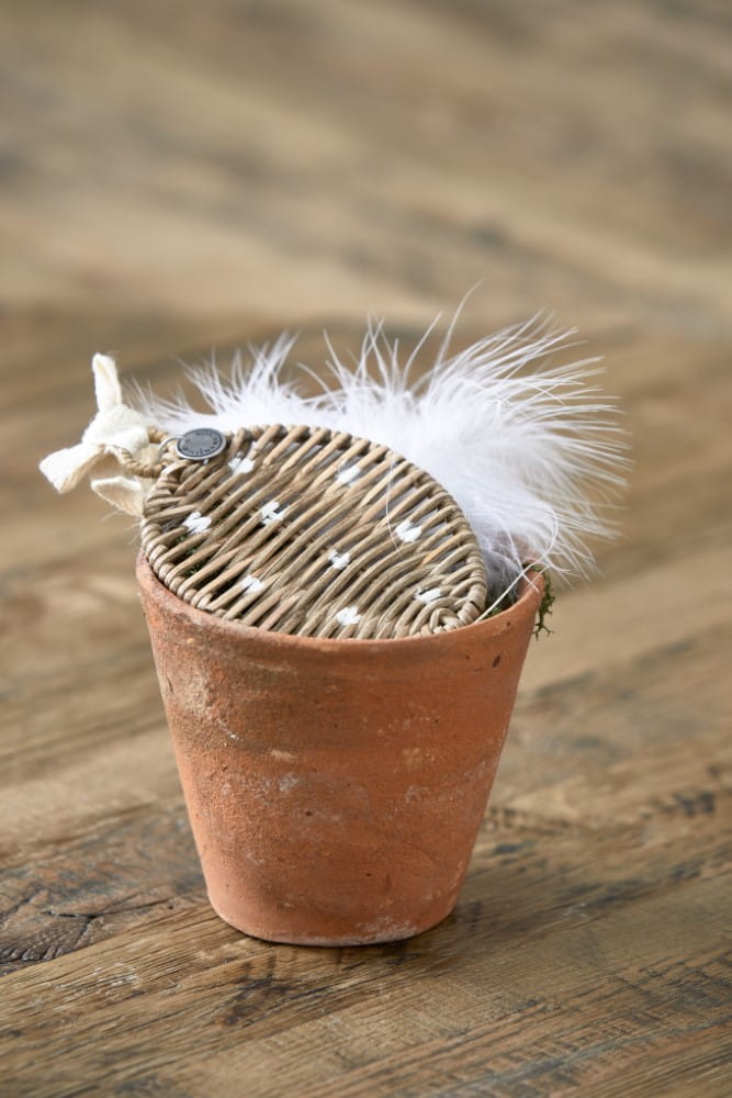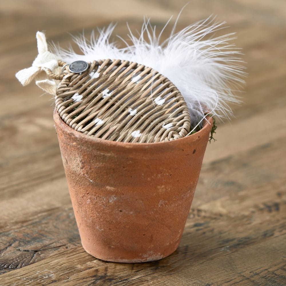 Zawieszka wykonana jest z ręcznie plecionego, naturalnego rattanu, na którym zostały namalowane małe białe kropki.