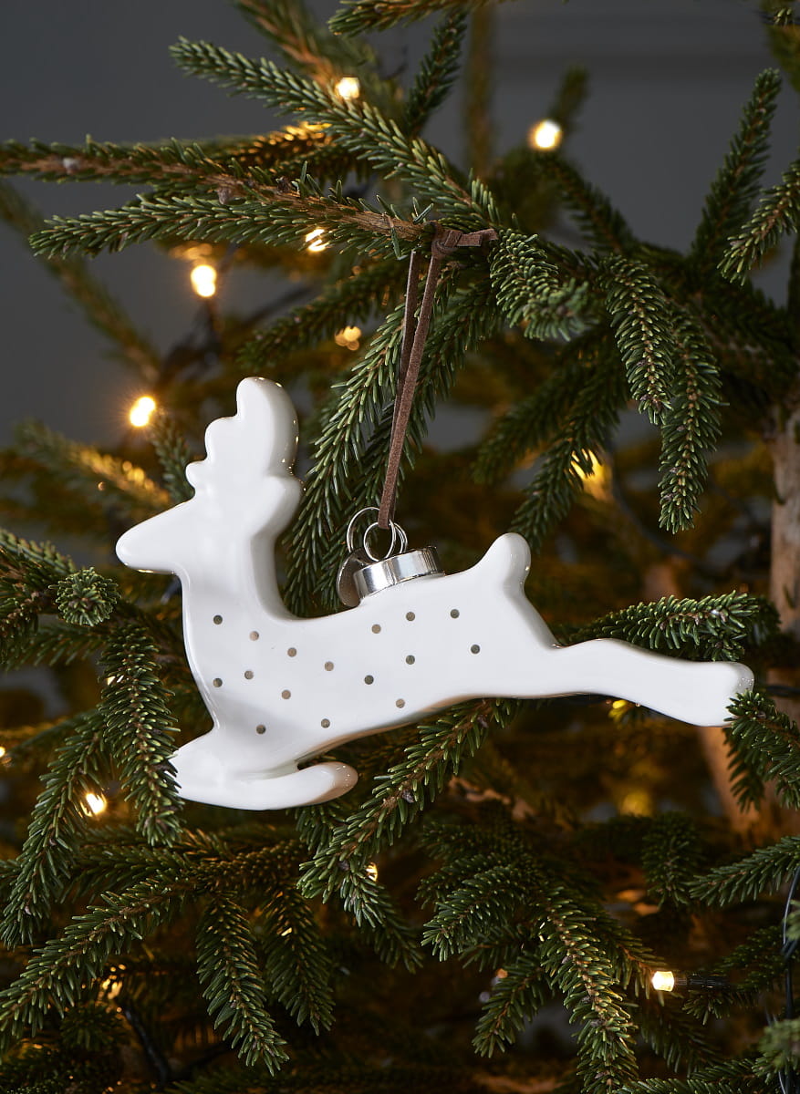 Biały jeleń świąteczny wykonany jest z porcelany - jest ozdobiony kropkami.