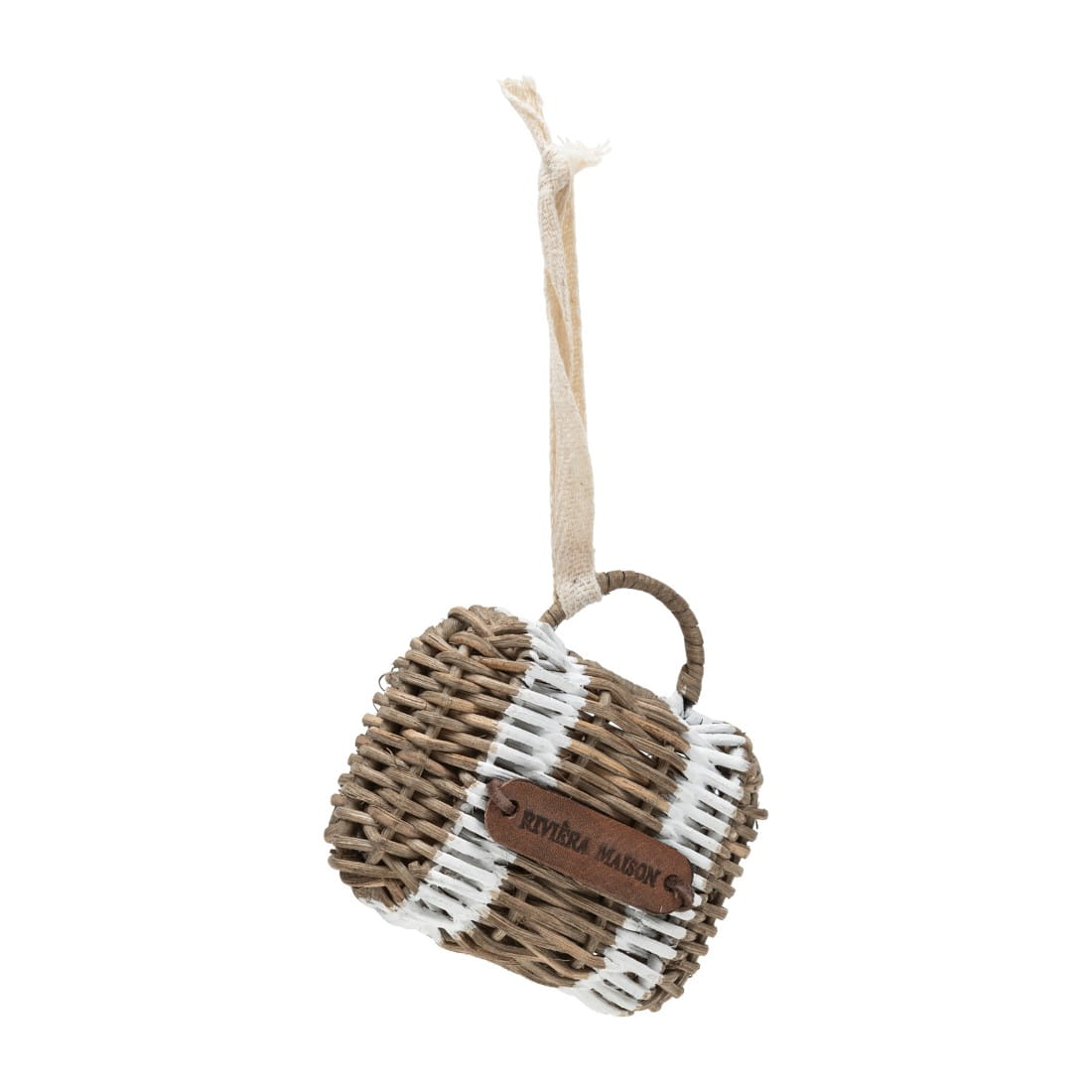 Odkryj ozdobę w kształcie walizki, która jest ozdobiona białymi paskami i ma skórzany detal z logo Riviera Maison.