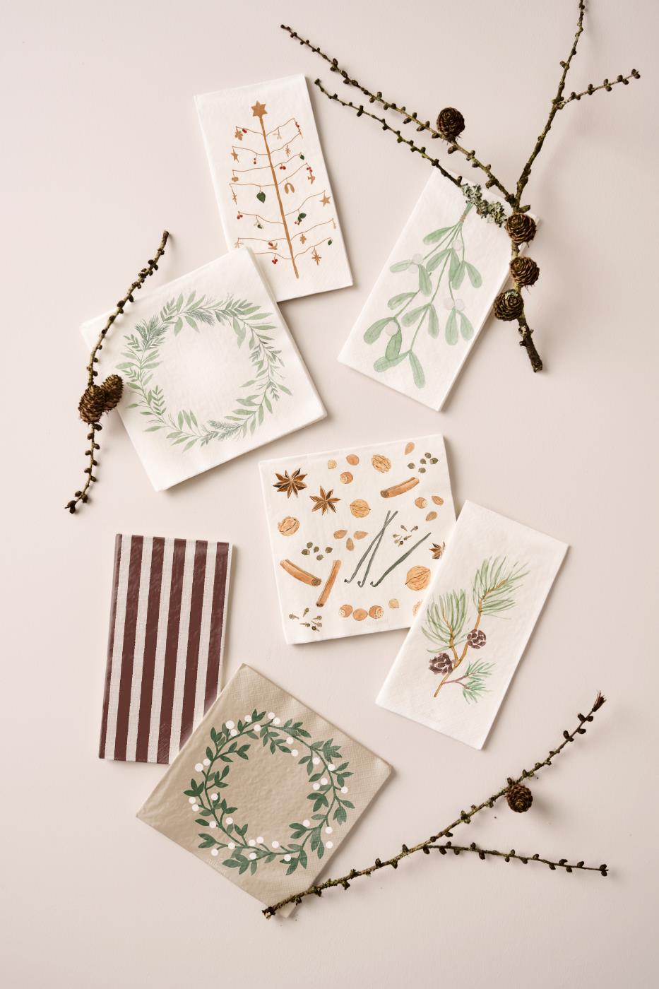 Serwetki Stillenat prezentują subtelny, świąteczny motyw w formie delikatnego wieńca z zielonych gałązek ozdobionych drobniutkimi, białymi jagodami. Wzór utrzymano w spokojnej, naturalnej palecie – zgaszona zieleń pięknie kontrastuje z kremowymi akcentami, a całość osadzono na ciepłym, beżowym tle. To połączenie tworzy niezwykle przytulny, skandynawski klimat, który doskonale wpisuje się w świąteczne dekoracje domu.