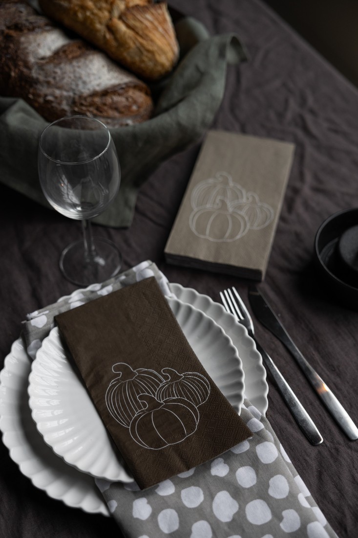 Prosty, a zarazem efektowny wzór sprawia, że nakrycie stołu nabiera wyjątkowego charakteru i staje się pełne sezonowego wdzięku. Serwetki pięknie komponują się z naturalnymi dekoracjami – dyniami, świecami czy ceramicznymi dodatkami.