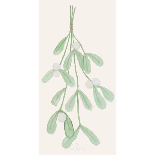 Serwetki Stillenat wyróżniają się subtelną, akwarelową ilustracją gałązki jemioły – symbolem zimowego ciepła i świątecznej tradycji. Projekt powstał w całości w studiu marki, dzięki czemu zachowuje unikatowy, miękki charakter ręcznego malunku.