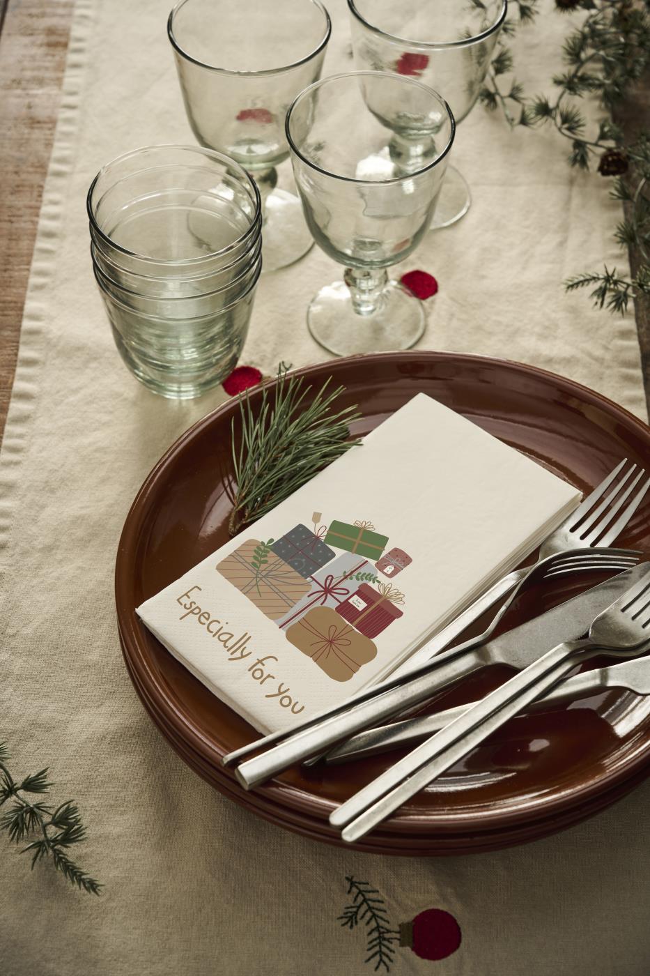 Serwetki Stillenat zachwycają uroczym, ręcznie ilustrowanym motywem świątecznych prezentów, tworząc atmosferę radości i oczekiwania. Projekt został stworzony przez projektantkę marki, dlatego każdy detal wygląda jak narysowany delikatną kreską i wypełniony miękkimi, stonowanymi kolorami.