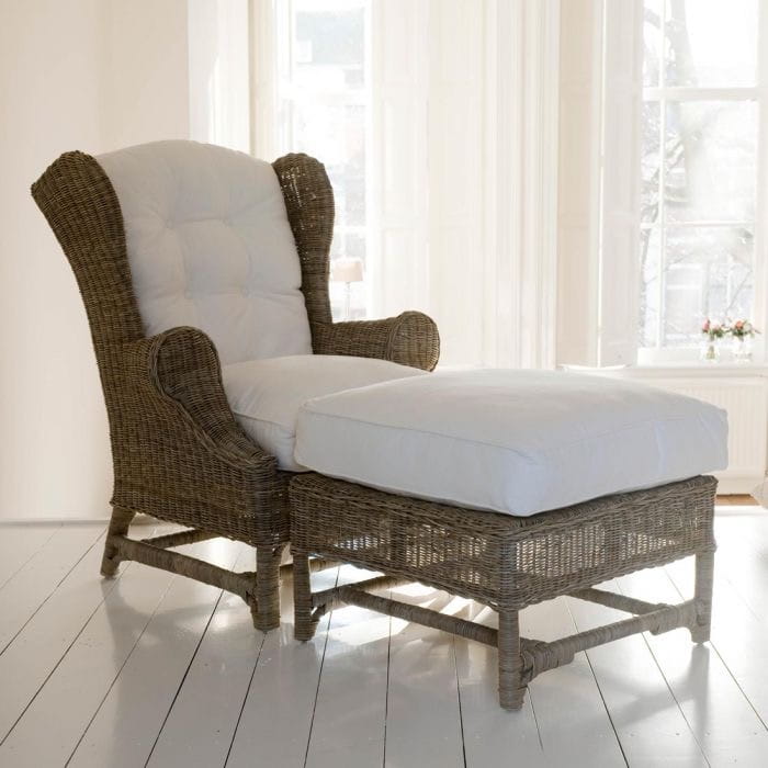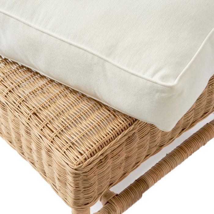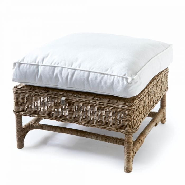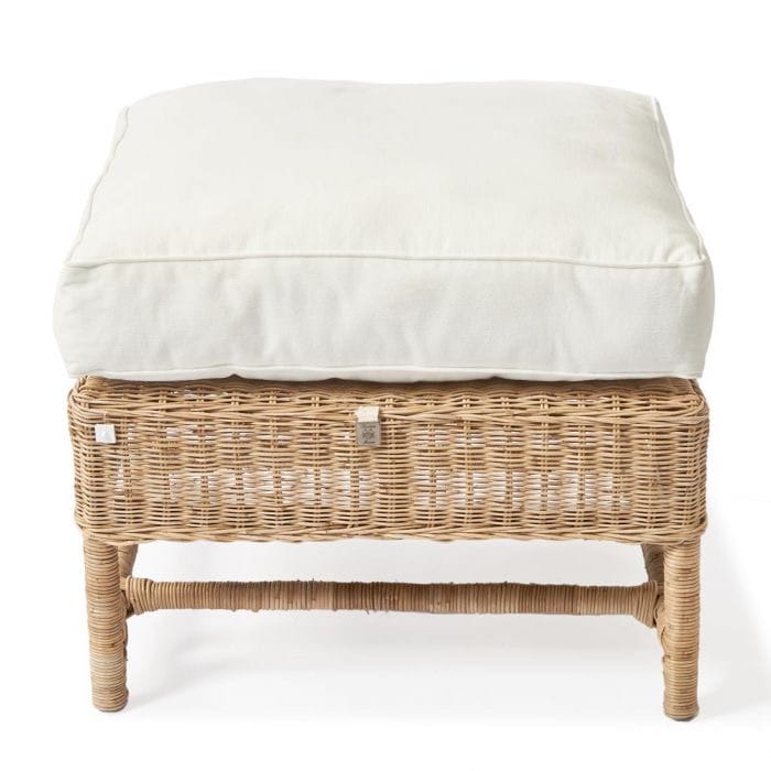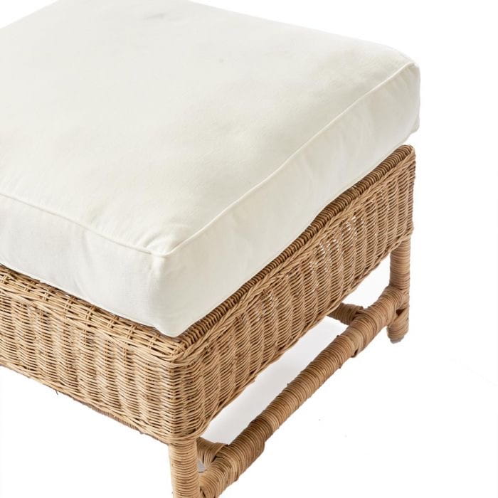 Klasyczny podnóżek Riviera Maison wykonany z rattanu . W komplecie poduszka siedziska w kolorze ciepłej bieli.