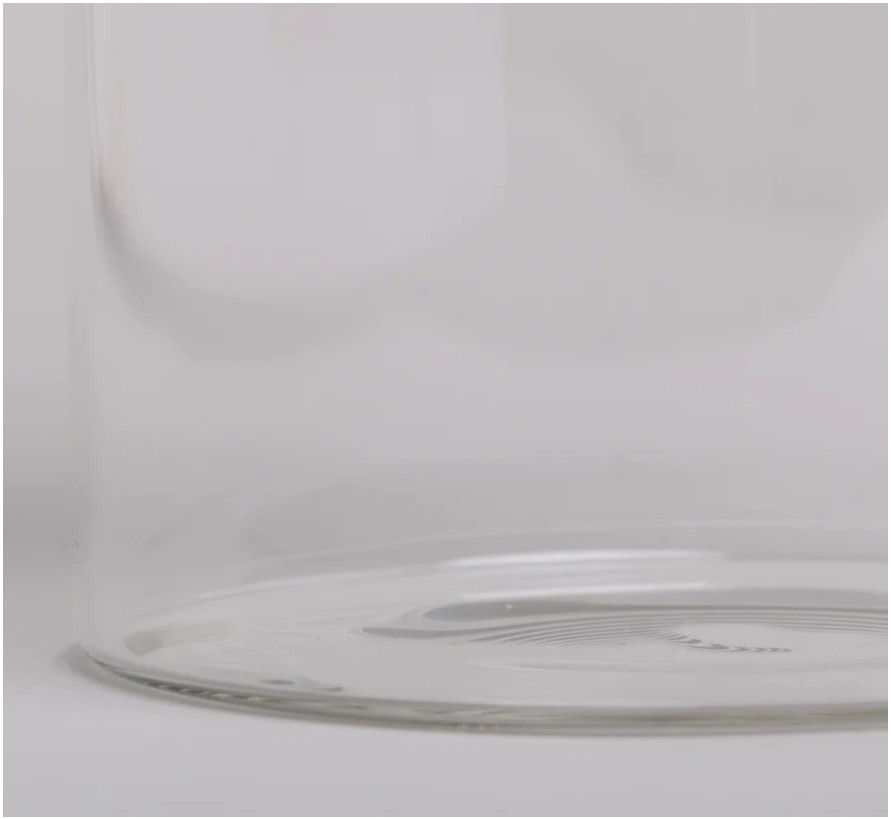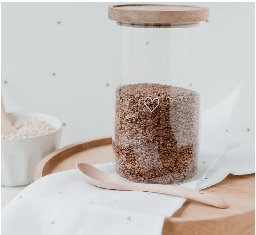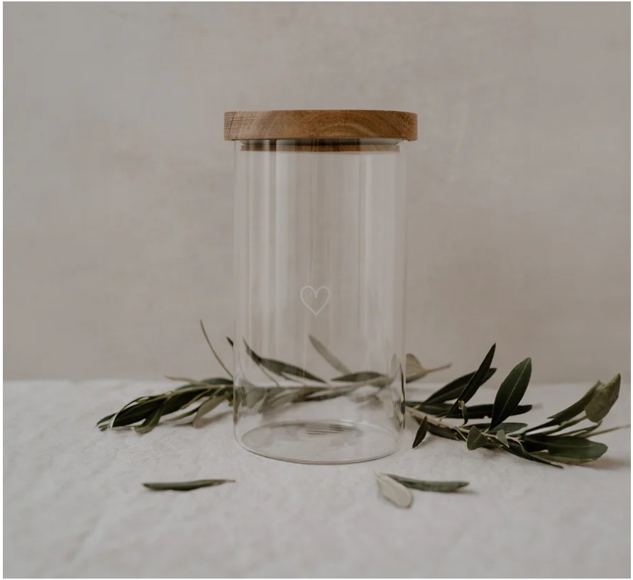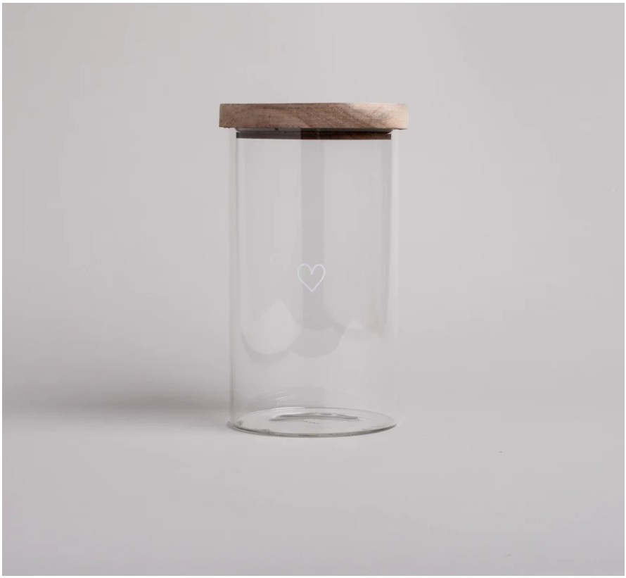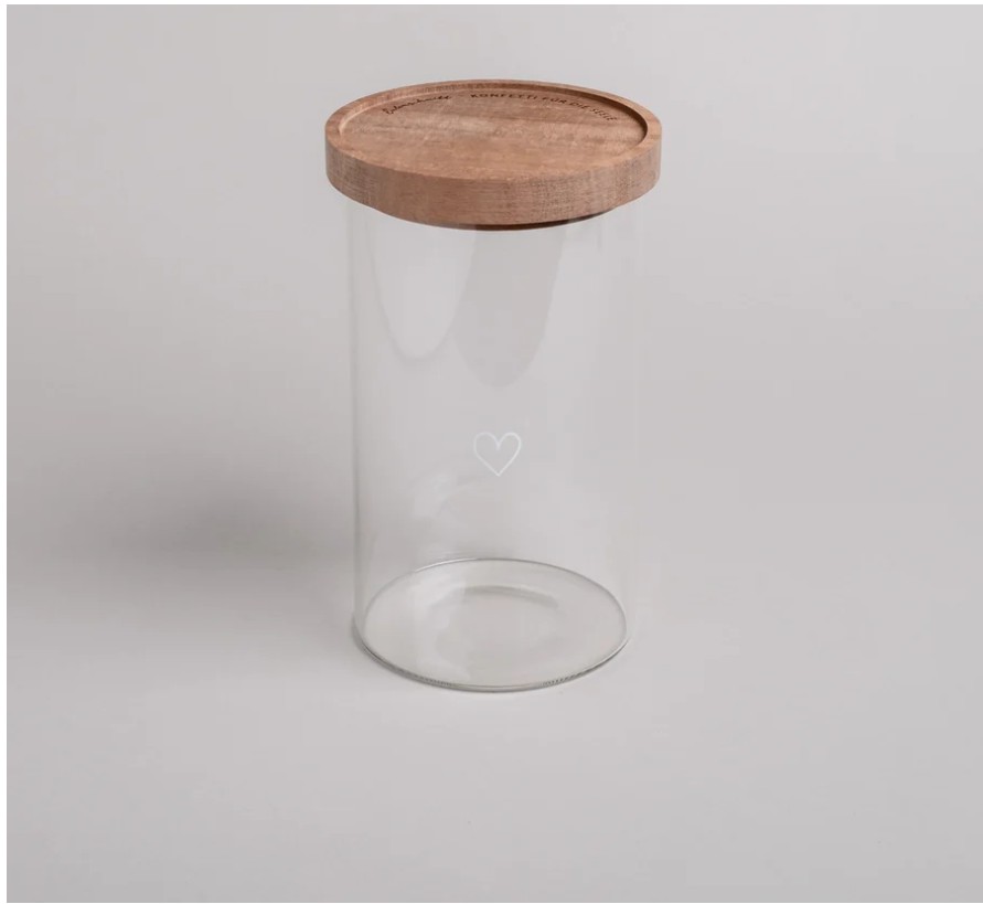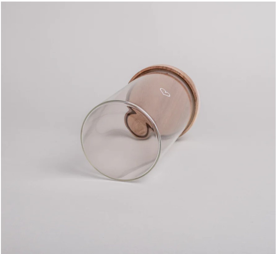 Praktyczny i dekoracyjny pojemnik z wytrzymałego szkła borokrzemowego, ozdobiony białym nadrukiem i zamykany pokrywką z naturalnego drewna