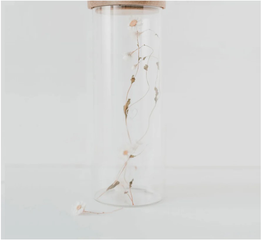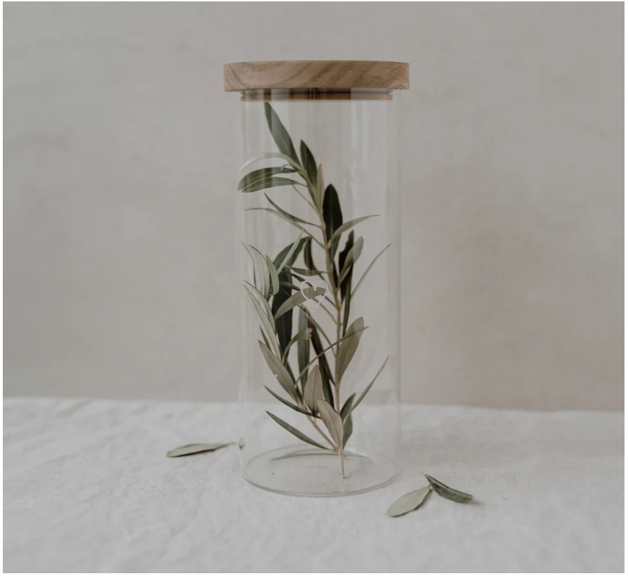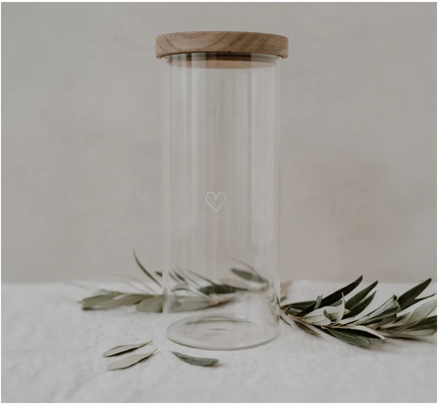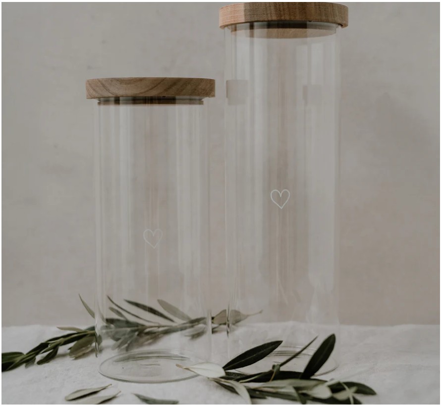 Praktyczny i dekoracyjny pojemnik z wytrzymałego szkła borokrzemowego, ozdobiony białym nadrukiem i zamykany pokrywką z naturalnego drewna