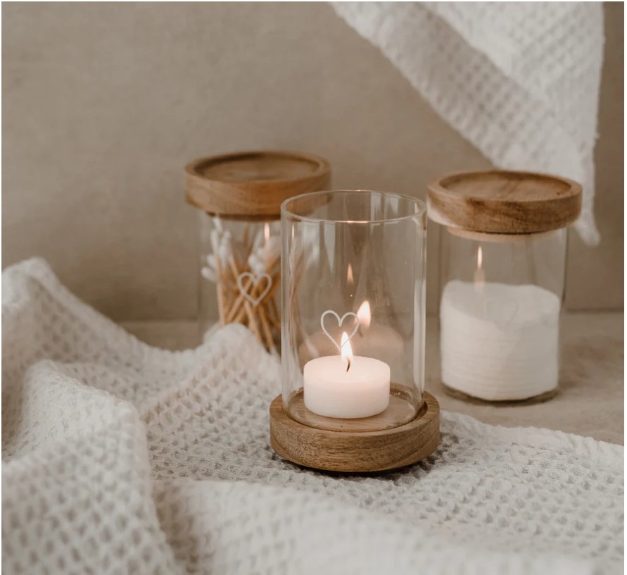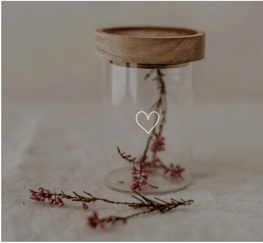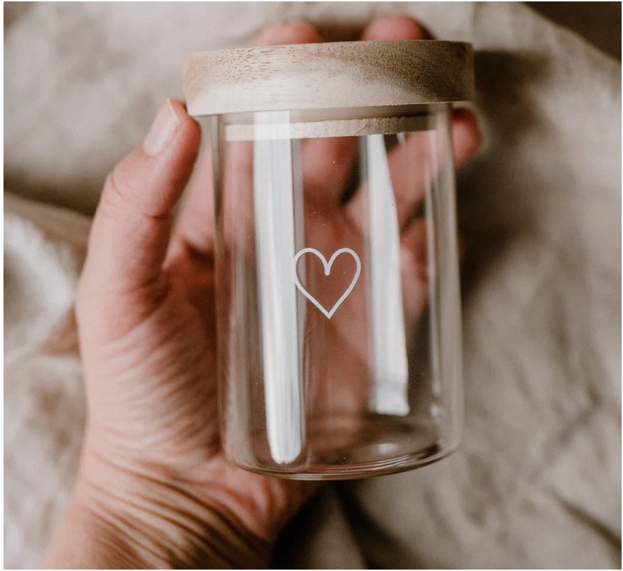 Stylowy mini pojemnik z trwałego szkła borokrzemowego, ozdobiony białym nadrukiem w kształcie serca.