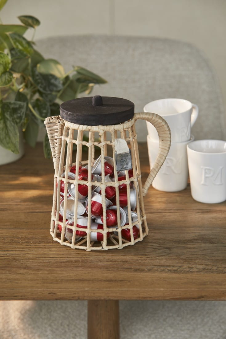 Wyjątkowy pojemnik o kształcie staromodnego dzbanka do kawy jest starannie tkany z rustykalnego rattanu i ma uroczą drewnianą pokrywkę.