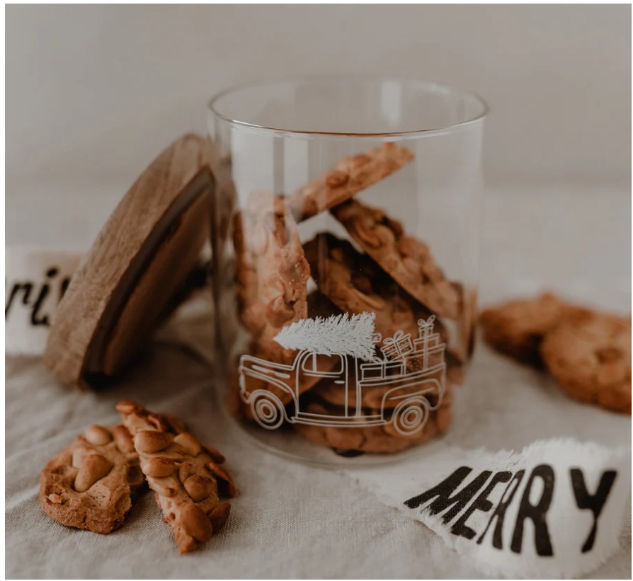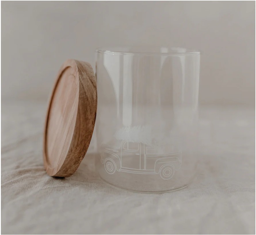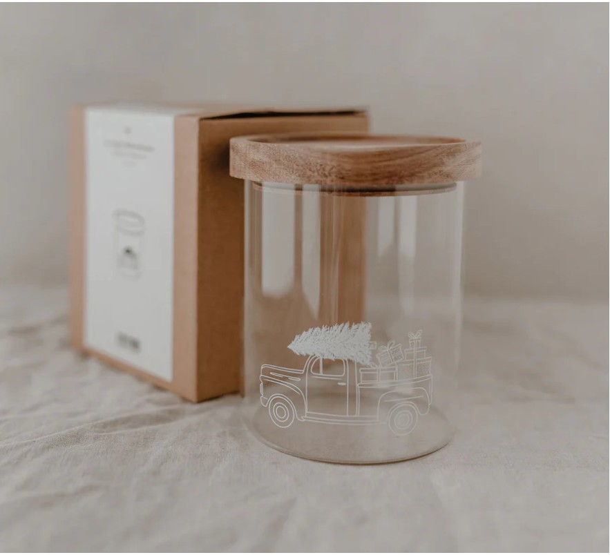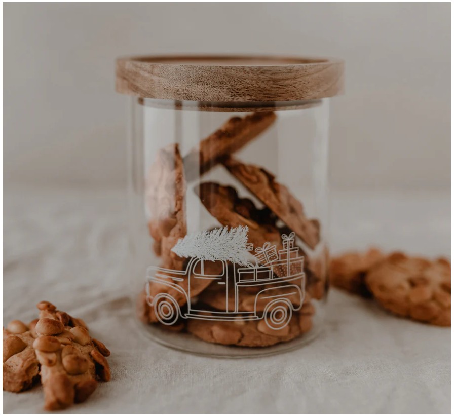 Praktyczny i dekoracyjny pojemnik z wytrzymałego szkła borokrzemowego, ozdobiony białym nadrukiem z uroczym motywem świątecznego auta.