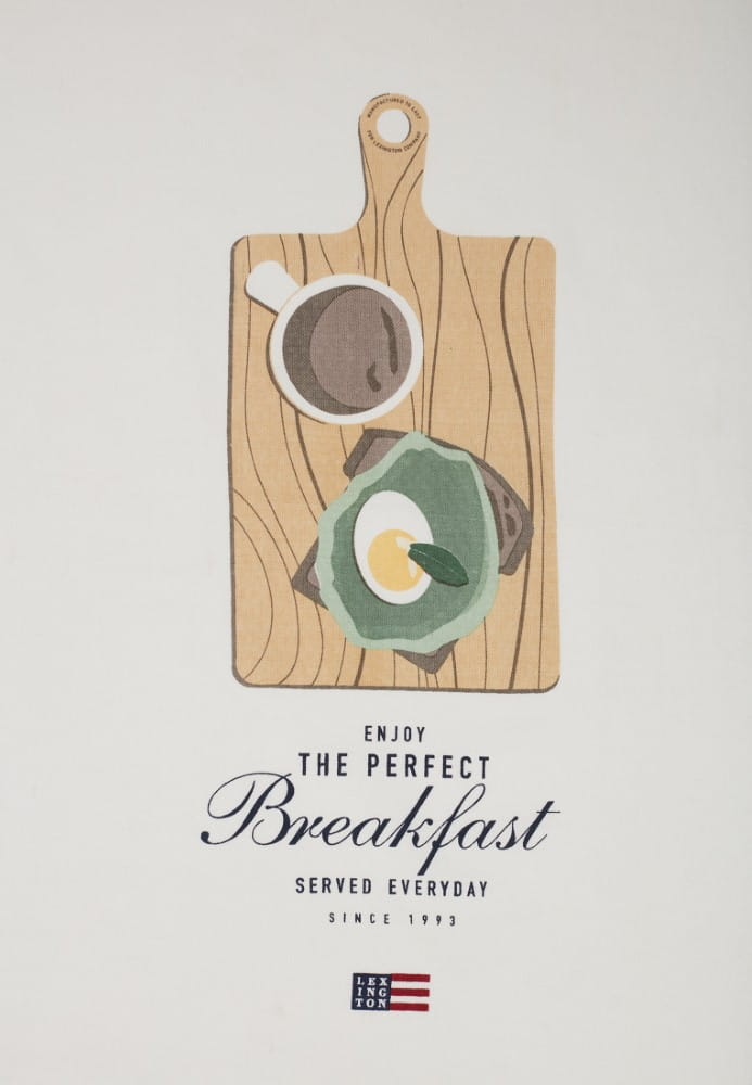 Ten ręcznik kuchenny jest uszyty z organicznej bawełny o splocie skośnym i posiada nadruk inspirowanym śniadaniem . Ten ręcznik kuchenny z organicznej bawełny jest również wykończony złożonym brzegiem, logo flagi Lexington z przodu