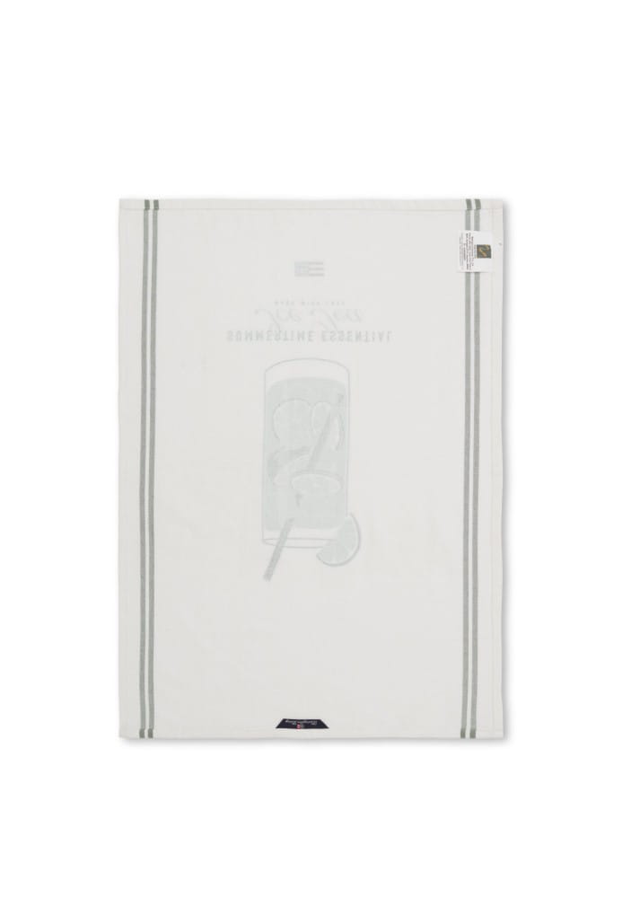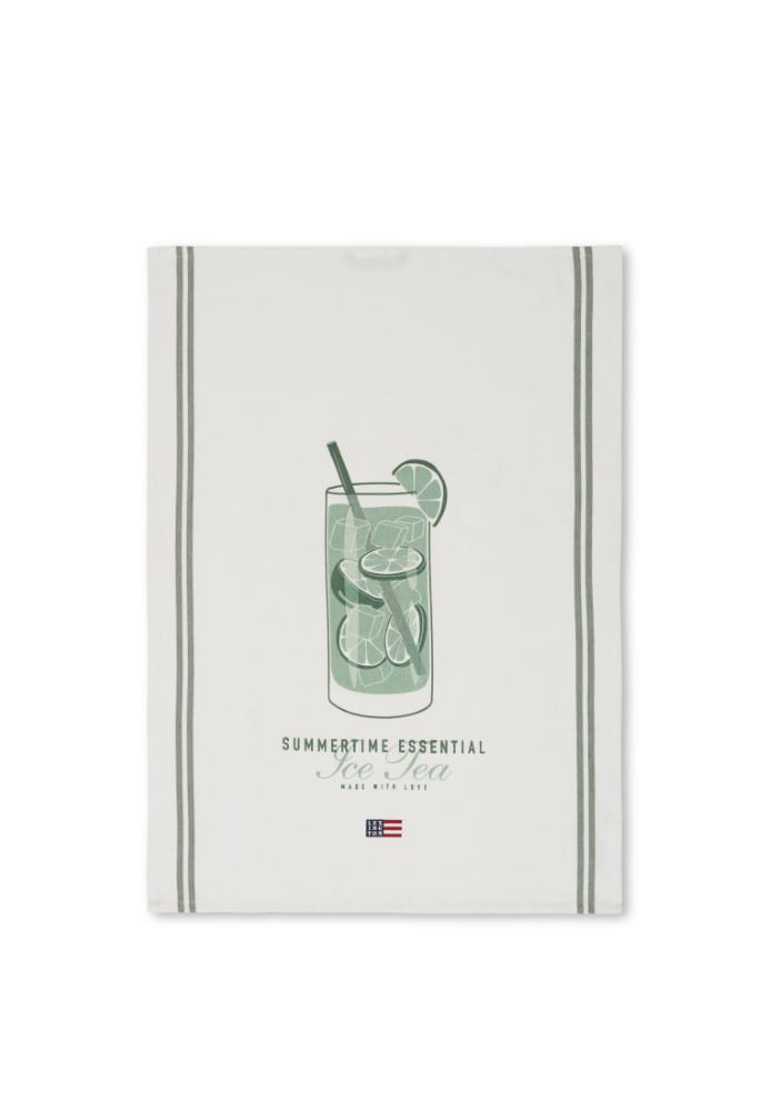 Ten ręcznik kuchenny, utkany z organicznej bawełny ze skośnym splotem, stanowi artystyczną interpretację orzeźwiającej mrożonej herbaty z nadrukiem umieszczonym pomiędzy paskami z barwionej przędzy.