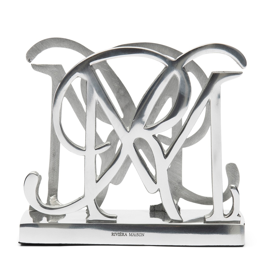 Wykonany z metalu o lśniącym wykończeniu, przyciąga uwagę dekoracyjnym motywem w formie misternie ułożonych liter RM.