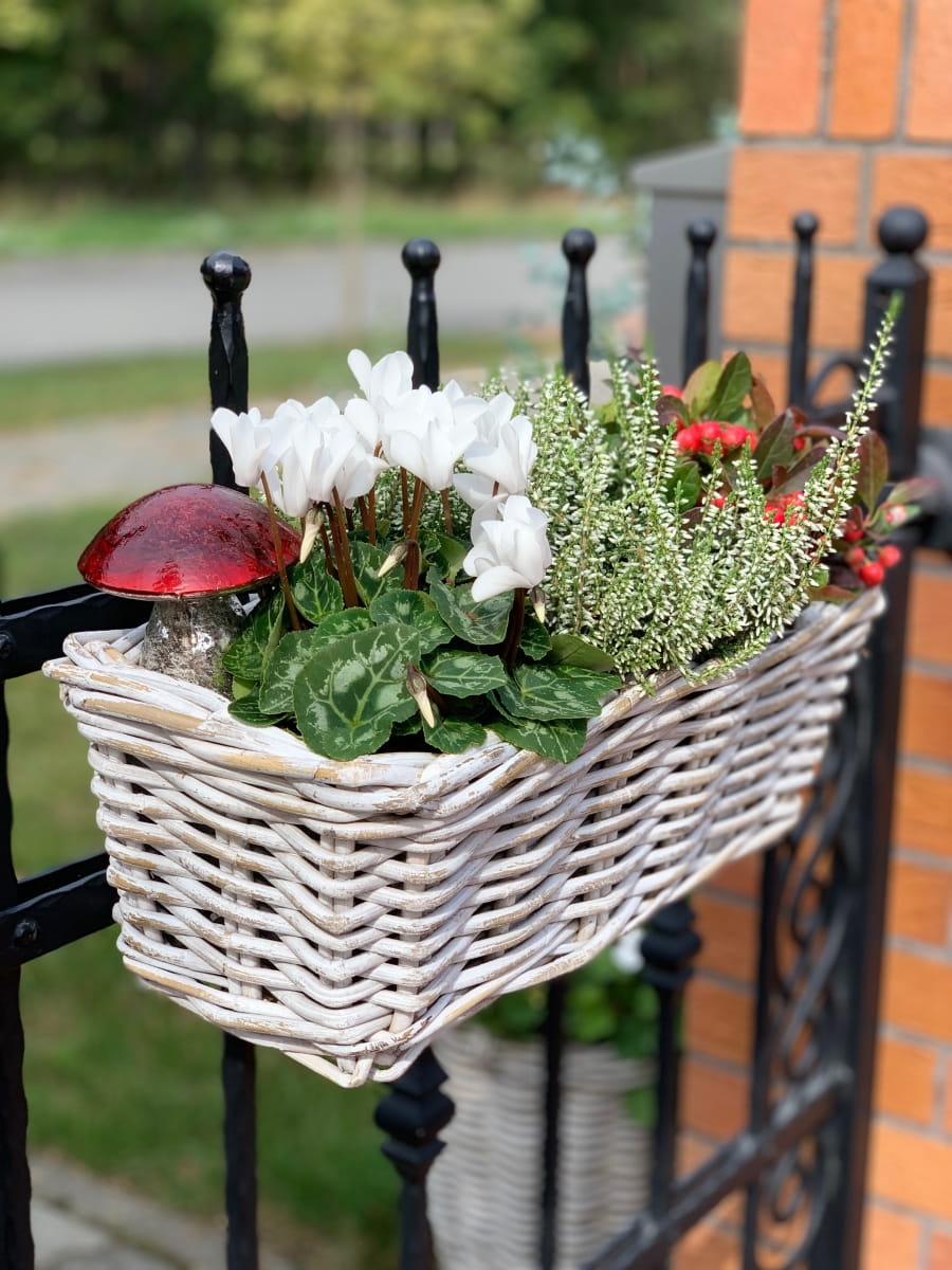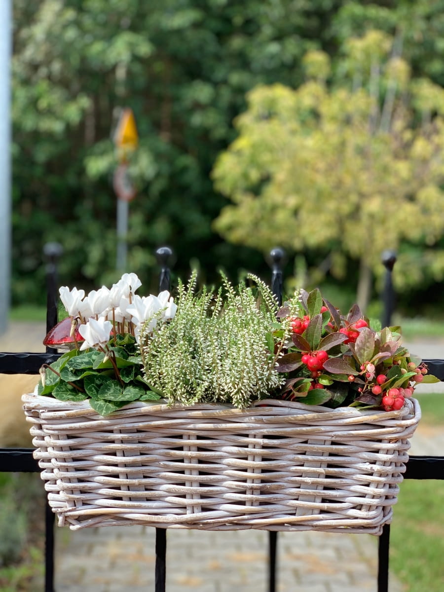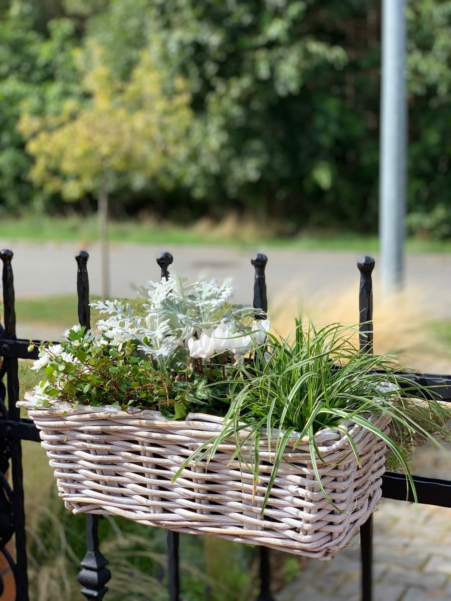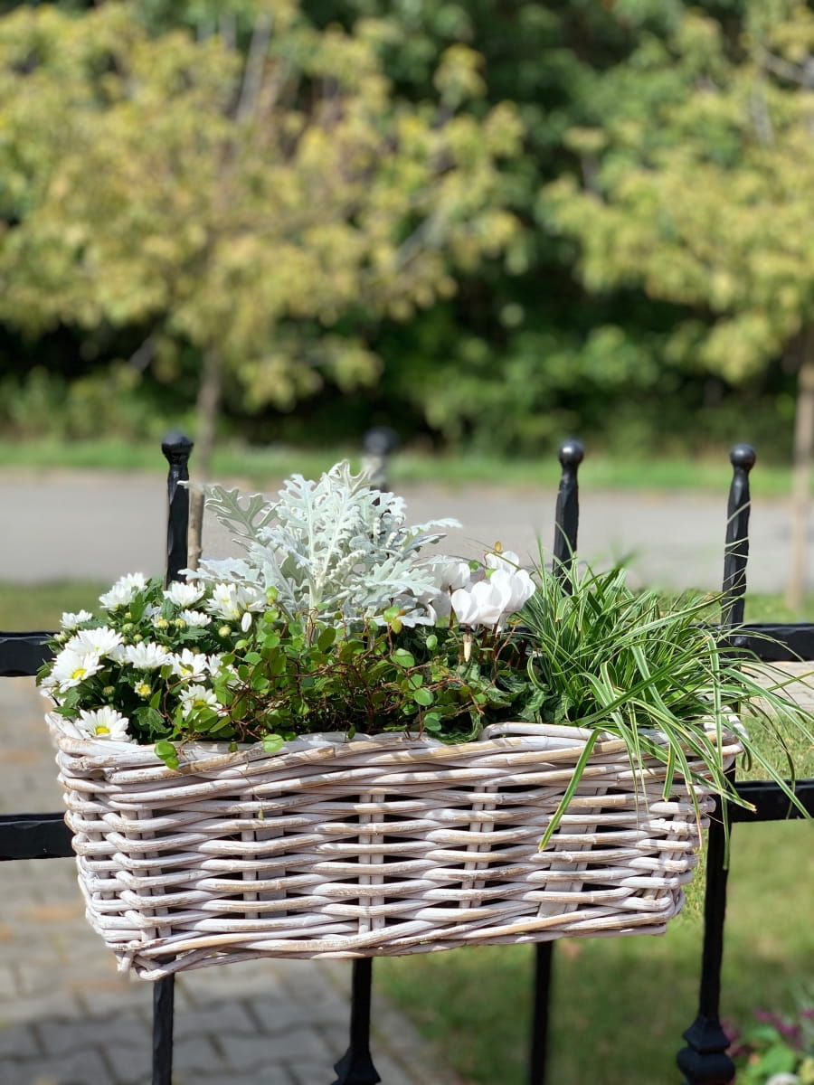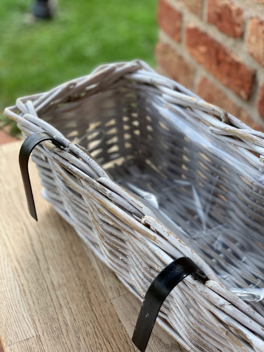 Nasadzenia w tak pięknym korytku rattanowym ręcznie wyplatanym idealnie wyeksponują rośliny sezonowe lub zioła na balkonie,