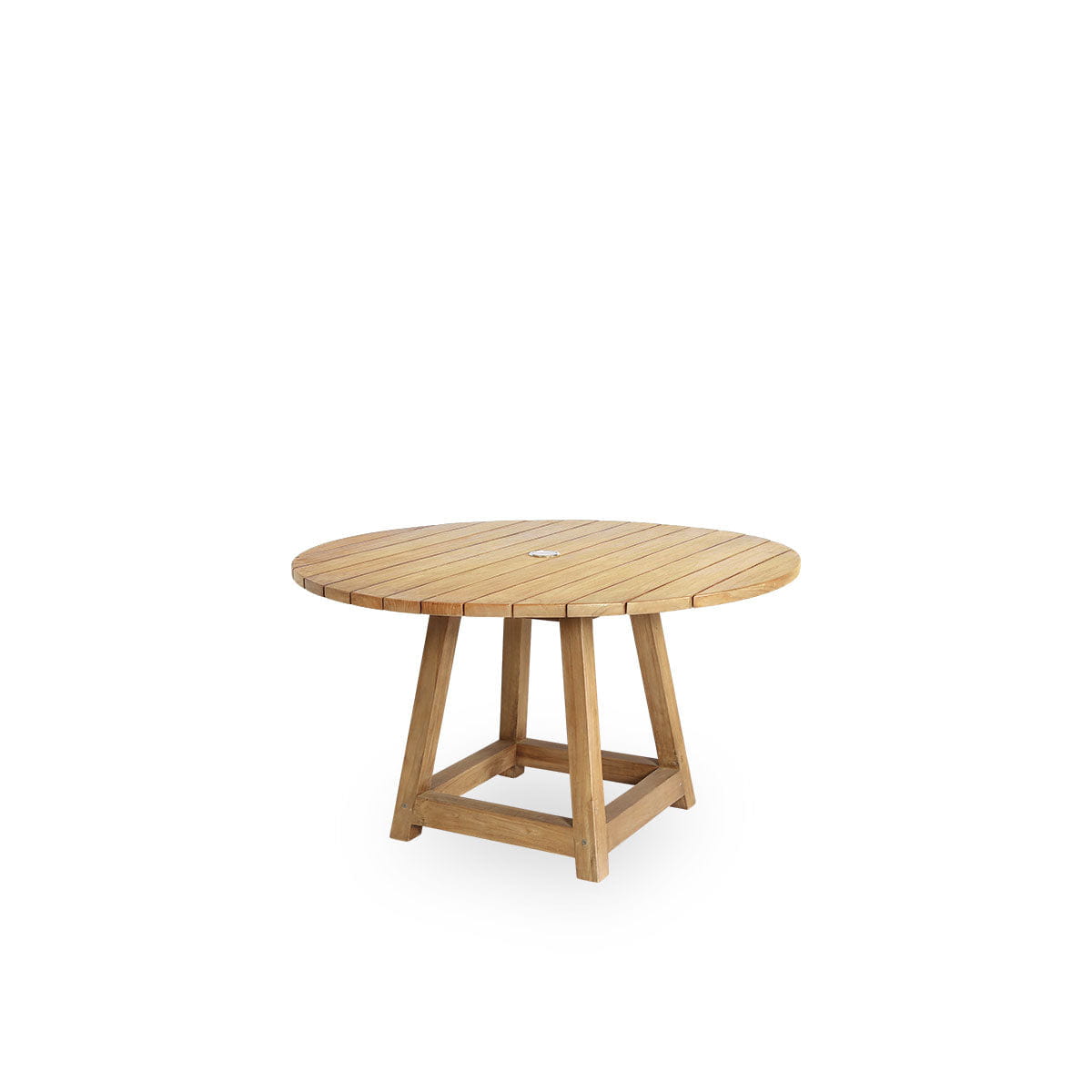 W centrum blatu znajduje się praktyczny otwór na parasol (średnica 5 cm), który można zakryć dołączoną elegancką zaślepką. Deski ułożone są z lekkimi przerwami, co pozwala drewnu naturalnie pracować w zależności od warunków pogodowych. Dzięki wysokiej zawartości olejów teak jest odporny na wilgoć, promienie UV, pleśń i owady, dlatego stół George może pozostawać na zewnątrz przez cały rok – bez potrzeby konserwacji.