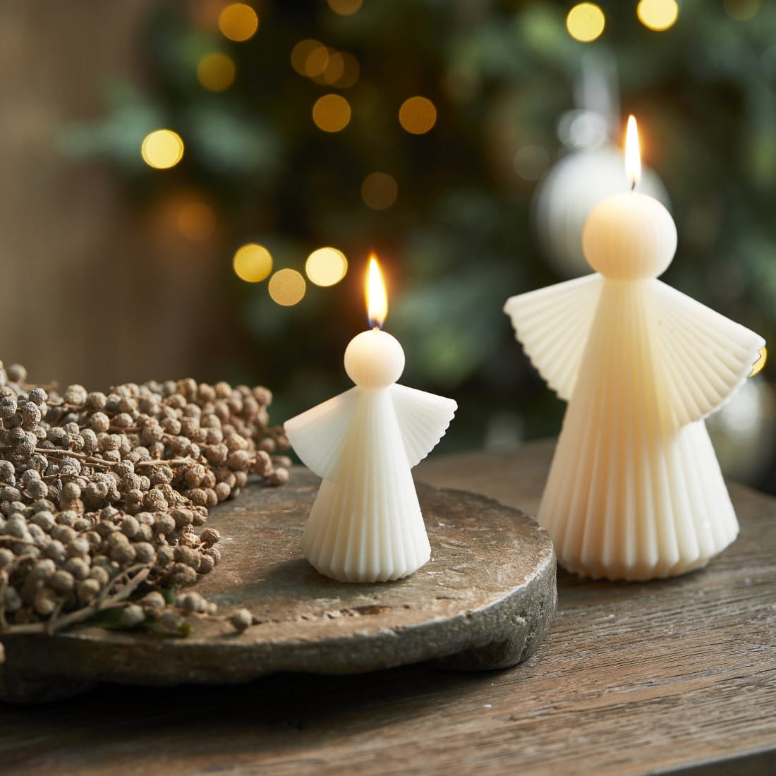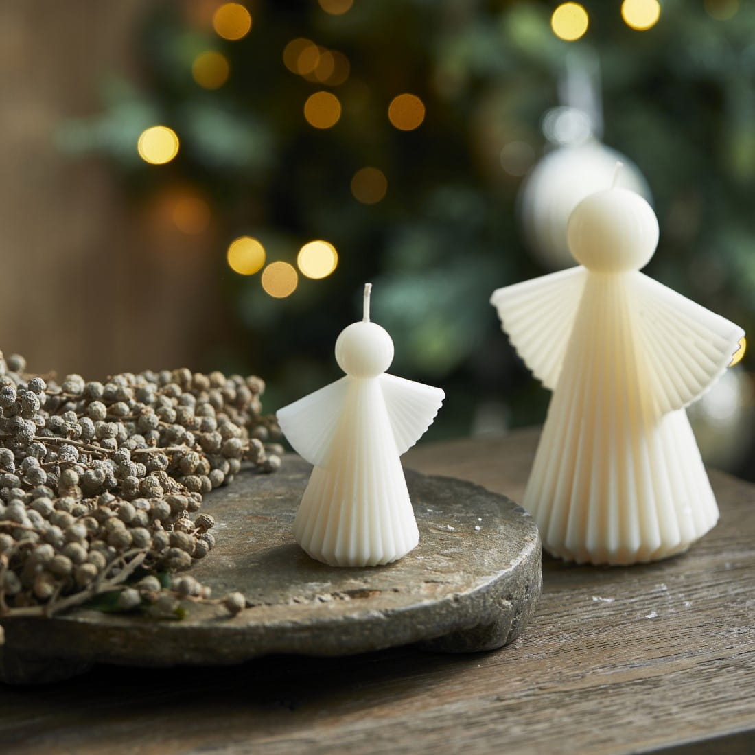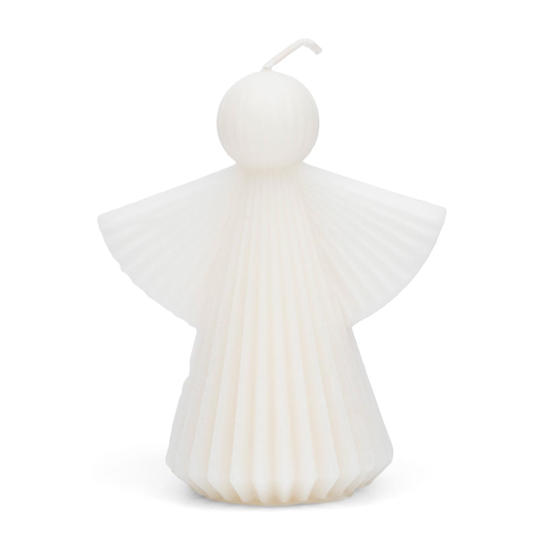 Piękna świeca w kształcie anioła ma delikatną żebrowaną fakturę.
