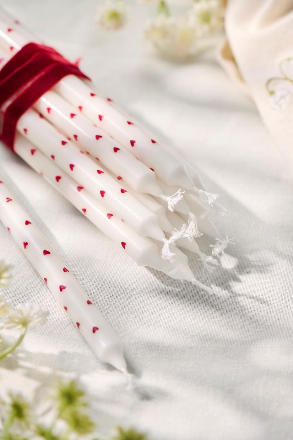 Wysoka, smukła świeca stołowa ozdobiona uroczym wzorem drobnych, czerwonych serduszek. To propozycja, która wprowadza do wnętrza ciepło i romantyczny nastrój – idealna na Święta, Walentynki, Dzień Mamy, kolację we dwoje lub jako miły drobiazg dla gospodyni domu.