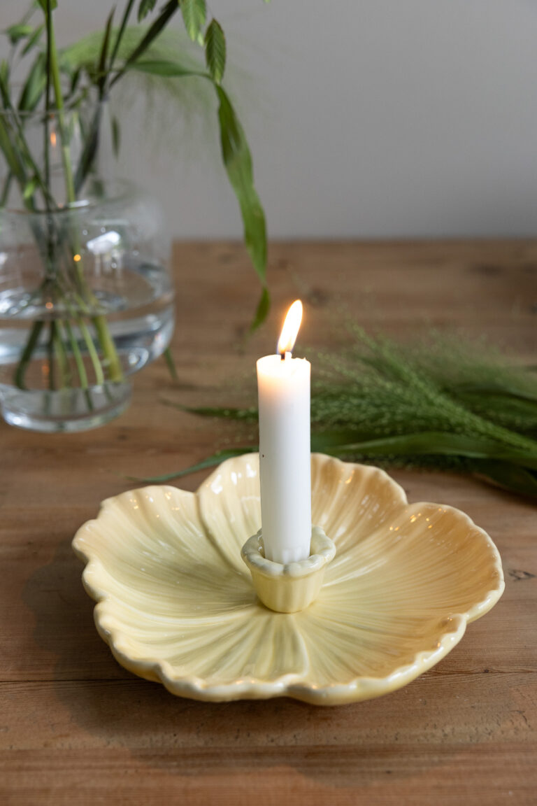 Organiczna forma inspirowana płatkami oraz stonowany, jasno żółty odcień pięknie rozprasza światło świecy, tworząc ciepłą i spokojną atmosferę.