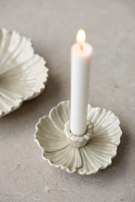 Organiczna forma inspirowana płatkami oraz stonowany, beżowy odcień pięknie rozprasza światło świecy, tworząc ciepłą i spokojną atmosferę.