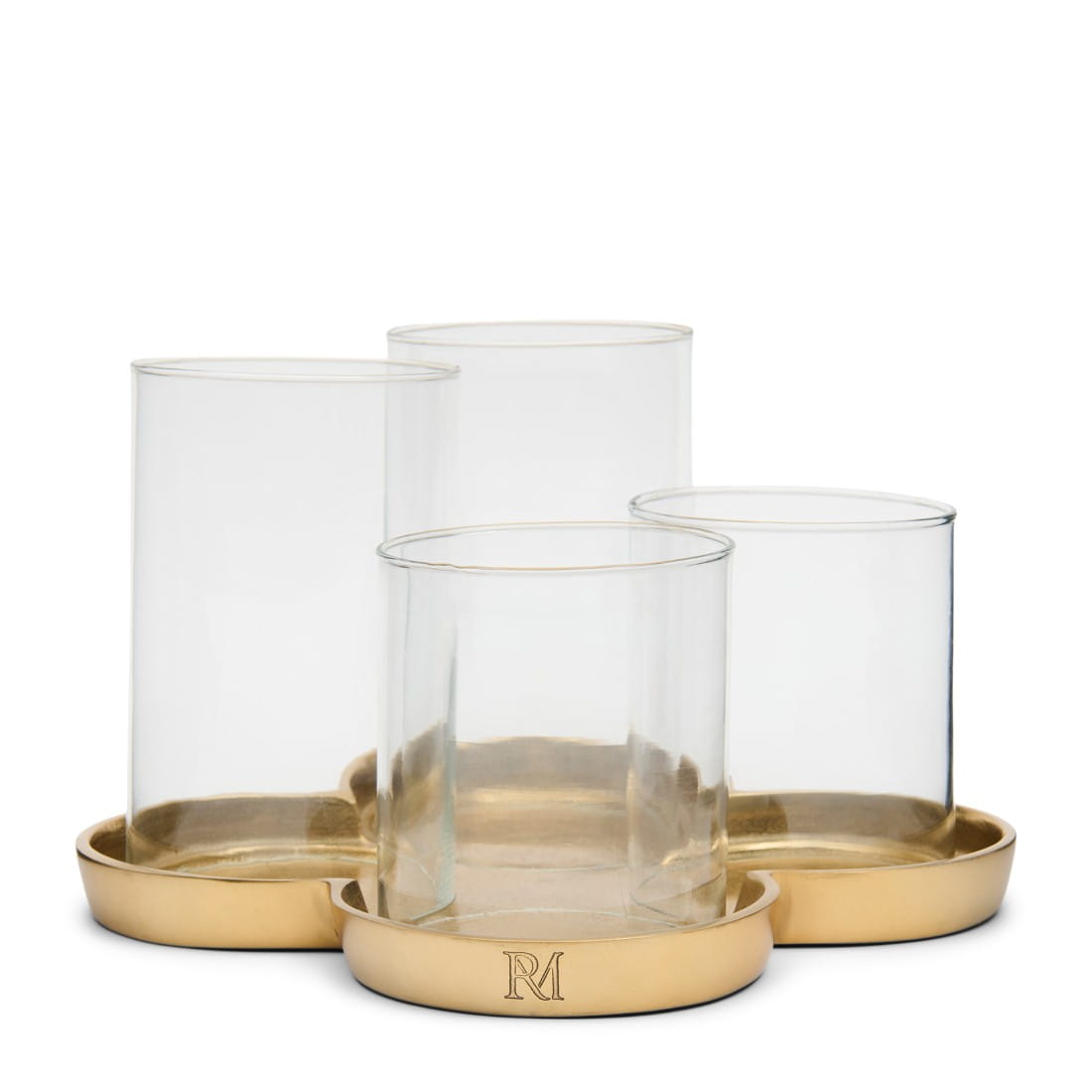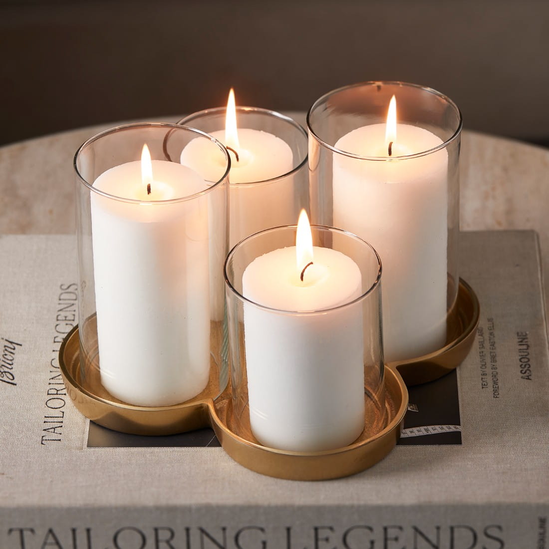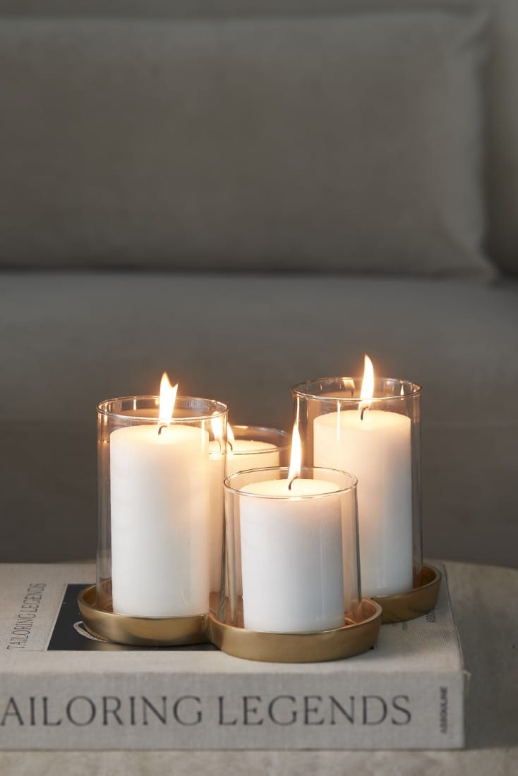 jak i nowoczesnym. Cylindryczne osłony ze szkła chronią płomień świecy, dodając jednocześnie subtelnego blasku otoczeniu.